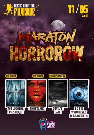 11 maja, Nocne Maratony Filmowe zapraszają Fanów mocnych wrażeń na noc z czterema horrorami, po obejrzeniu których będziecie mieli obawy przed zgaszeniem światła nawet we własnym domu. Na początek, realizowany w najsłynniejszym nawiedzonym domu w Irlandii - THE LODGERS. PRZEKLĘCI. Dalej kolejna premiera, zbierający świetne opinie horror GHOSTLAND i na dwa tygodnie przed polską premierą, przerażający DEVIL’S GATE. Dla najodważniejszych mamy deser w postaci CO SIĘ WYDARZYŁO W GRACEFIELD.