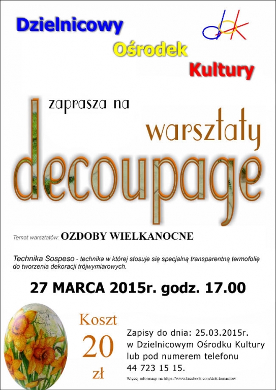 Dzielnicowy Ośrodek Kultury serdecznie zaprasza sympatyków techniki decoupage do udziału w wielkanocnych warsztatach sztuki użytkowej. W trakcie spotkania techniką Sospeso stworzone zostaną niepowtarzalne ozdoby na wielkanocny stół. Wielkanocne jajo można ozdobić na wiele sposobów.