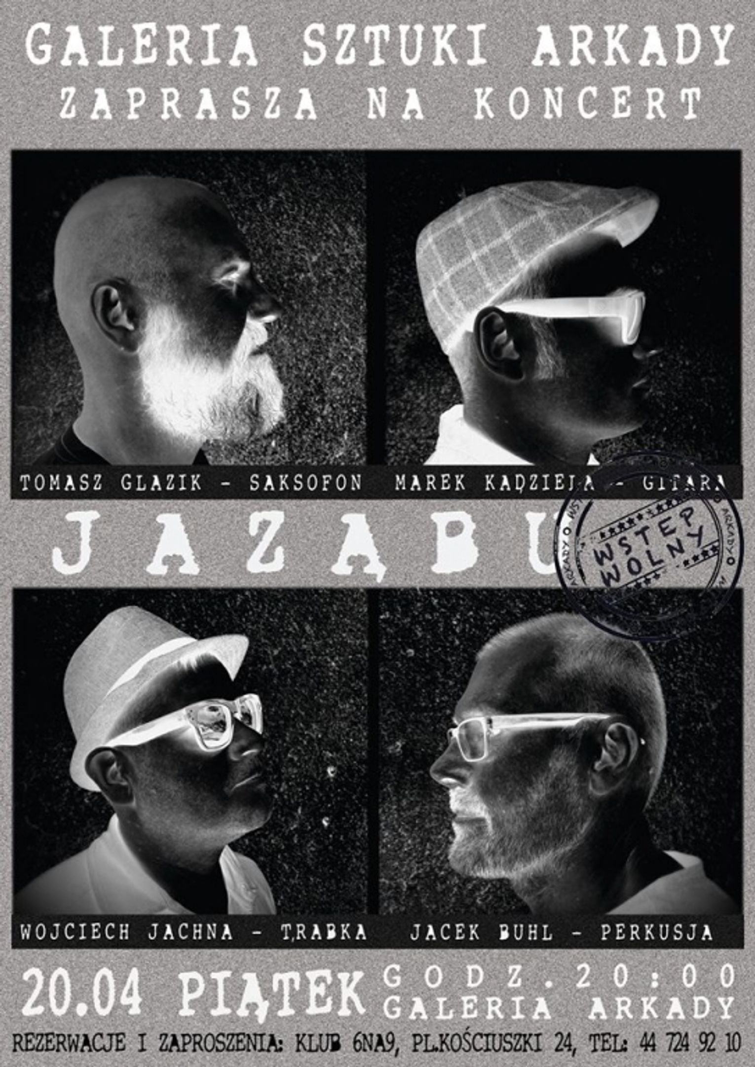Zapraszamy 20. kwietnia o godz. 20:00 do Galerii Sztuki Arkady na koncert jazzowy. Wystąpią: Wojciech Jachna, Tomasz Glazik, Marek Kądziela, Jacek Buhl.