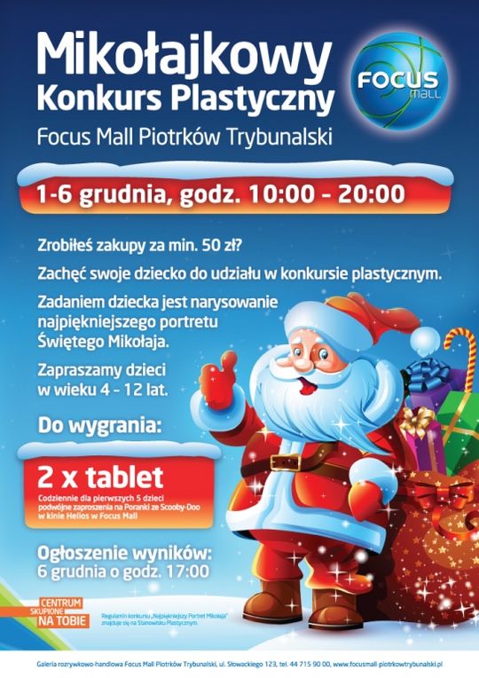 Co zrobić, aby wygrać tablet? Wystarczy w dniach od 1 do 6 grudnia 2014 roku zrobić zakupy w dowolnym sklepie lub punkcie usługowym w galerii Focus Mall Piotrków Trybunalski co najmniej za 50 zł. Następnie należy udać się stanowisko plastyczne, przy fontannie na parterze galerii, które będzie czynne w godzinach od 10.00 do 20.00. Hostessa zarejestruje na nim paragon zaś rodzic lub opiekun prawny wypełni odpowiedni formularz. Zadaniem konkursowym dziecka będzie wykonanie portretu Świętego Mikołaja. Uczestnicy podzieleni zostaną na 2 grupy wiekowe: od 4 do 7 oraz od 8 do 12 lat. Zwycięzców wyłoni jury konkursu. Warunkami odebrania nagrody są: obecność w czasie ogłaszania wyników 6 grudnia 2014 r. o godzinie 17.00, okazanie dowodu tożsamości przez rodzica lub opiekuna prawnego dziecka oraz zarejestrowanego dowodu zakupu.