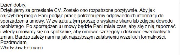 - Dziękujemy za przesłanie CV. Zostało ono rozpatrzone pozytywnie. Aby jak najszybciej mogła Pani podjąć pracę potrzebujemy odpowiednich informacji do sporządzenia umowy. W związku z tym proszę o wysłanie skanu lub zdjęcia dowodu osobistego. Po sporządzeniu umowy będzie Pani miała czas, aby się z nią zapoznać i wtedy umówimy się na spotkanie, aby omówić szczegóły i dokonać ewentualnych zmian. Bardzo zależy nam na jak najszybszym załatwieniu wszelkich formalności. Pozdrawiam Władysław Fellmann