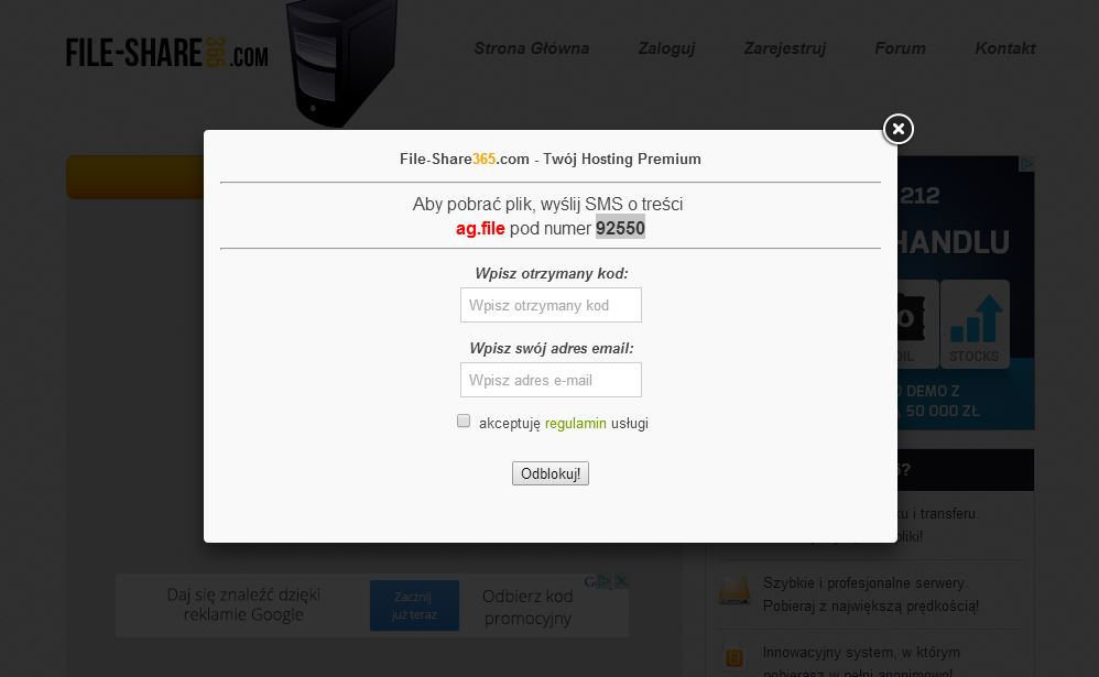 Oczywiście kliknęliśmy we wskazany lin. Po kliknięciu okazało się, że aby druk pobrać należy wysłać sms-a. Co ciekawe, jego koszt to 25 złotych netto czyli 30,50 z podatkiem VAT. O cenie dowiadujemy się jednak dopiero, kiedy postanowimy kliknąć w zaznaczone drobnym drukiem słowo: regulamin.