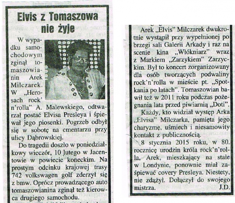 "W poniedziałkowy wieczór (10 lutego) w wypadku samochodowym w Jacentowie w powiecie koneckim zginął Arek Milczarek, który w Herosach Rock’n’Rolla Antoniego Malewskiego odtwarzał postać Elvisa Presleya i śpiewał jego piosenki. Pogrzeb odbędzie się w sobotę (15 lutego) o godzinie 11 na cmentarzu przy ulicy Dąbrowskiej".