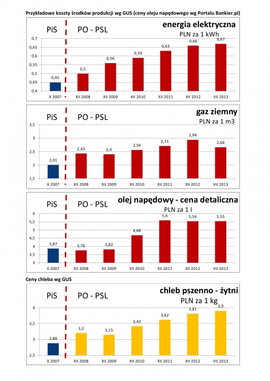 Ceny energii elektrycznej z roku na rok idą do góry. W roku 2007 cena energii elektrycznej wynosiła 45 groszy za 1 kWh , za rządów koalicji PO/PSL cena ta wzrosła już do 67 groszy za kWh.Nie ma właściwych mechanizmów zabezpieczających odbiorców energii przed wzrostem cen.