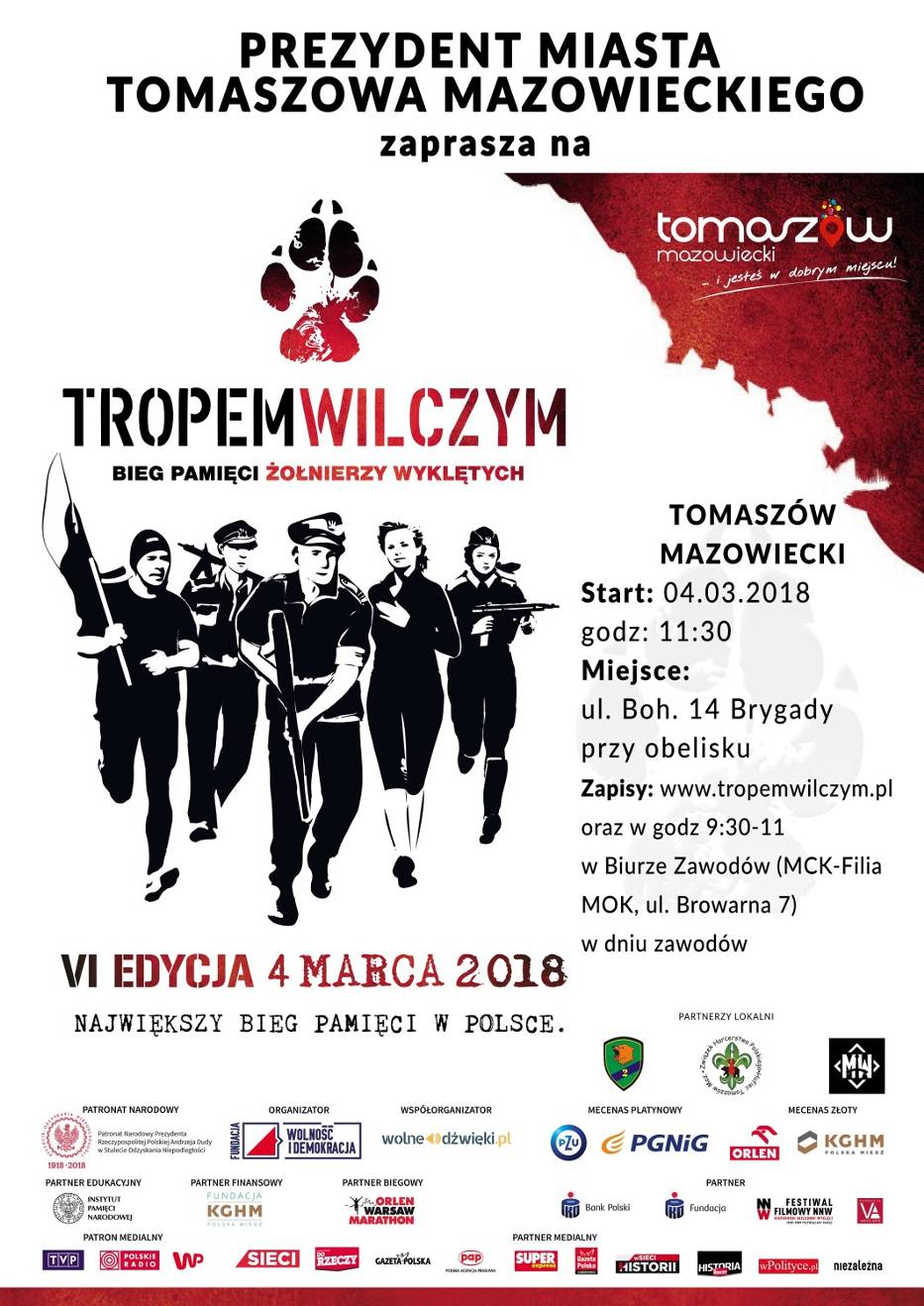 O godz.11.30 odbyły się się oficjalne uroczystości przy obelisku pamięci Żołnierzy Wyklętych z udziałem rodzin Tomaszowskich Żołnierzy Niezłomnych, znajdującym się przy ulicy Bohaterów 14 Brygady. Następnie tuż przed 12.00 Prezydent Miasta Pan Marcin Witko dał sygnał do startu VI Edycji Biegu Pamięci Żołnierzy Wyklętych-Tropem Wilczym.