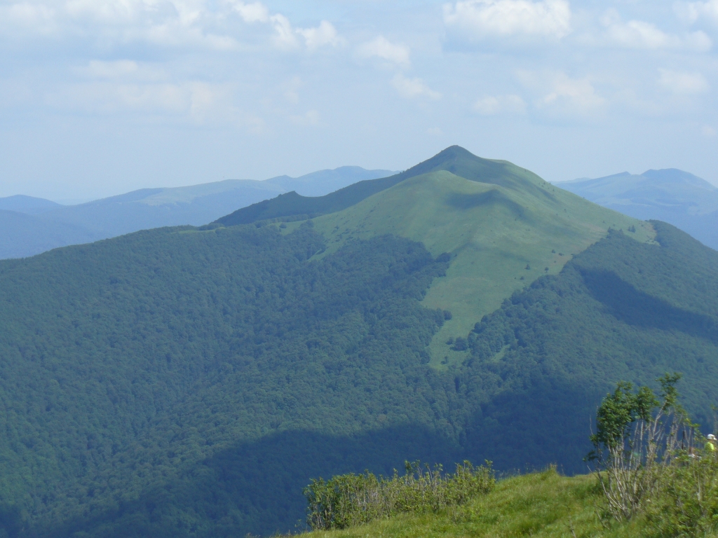 Na każdy dzień, a miało być i niestety było ich pięć, zaplanowaliśmy inne miejsce do zwiedzania. Skuszeni zachętą gospodyni zaczęliśmy od Bieszczadzkiej Ciuchci. Nie da się słowami opisać cudów przyrody widzianych przy pięknej pogodzie z poruszającej się majestatycznie otwartej kolejki, przecinającej góry, lasy i strumienie, kiedy z tylnych wagoników na licznych zakrętach można było zrobić zdjęcie lokomotywy. Po powrocie ruszyliśmy do Ustrzyk Górnych, żeby na tarasie jednej z kilku restauracji zjeść obfity posiłek. Jeśli chodzi o mnie, w bieszczadzkich restauracjach najbardziej smakowały mi…ryby. Kunsztownie przyrządzane pstrągi, łososie i nawet halibuty, elegancko podawane przez uprzejmą obsługę, smakowały nie gorzej wcale jak nad Bałtykiem. Po obiedzie wybraliśmy się przez Wołosate pod najwyższy bieszczadzki szczyt – Tarnicę. Widok z dołu był urzekający tak bardzo, że postanowiliśmy niezwłocznie zdobyć tę górkę.