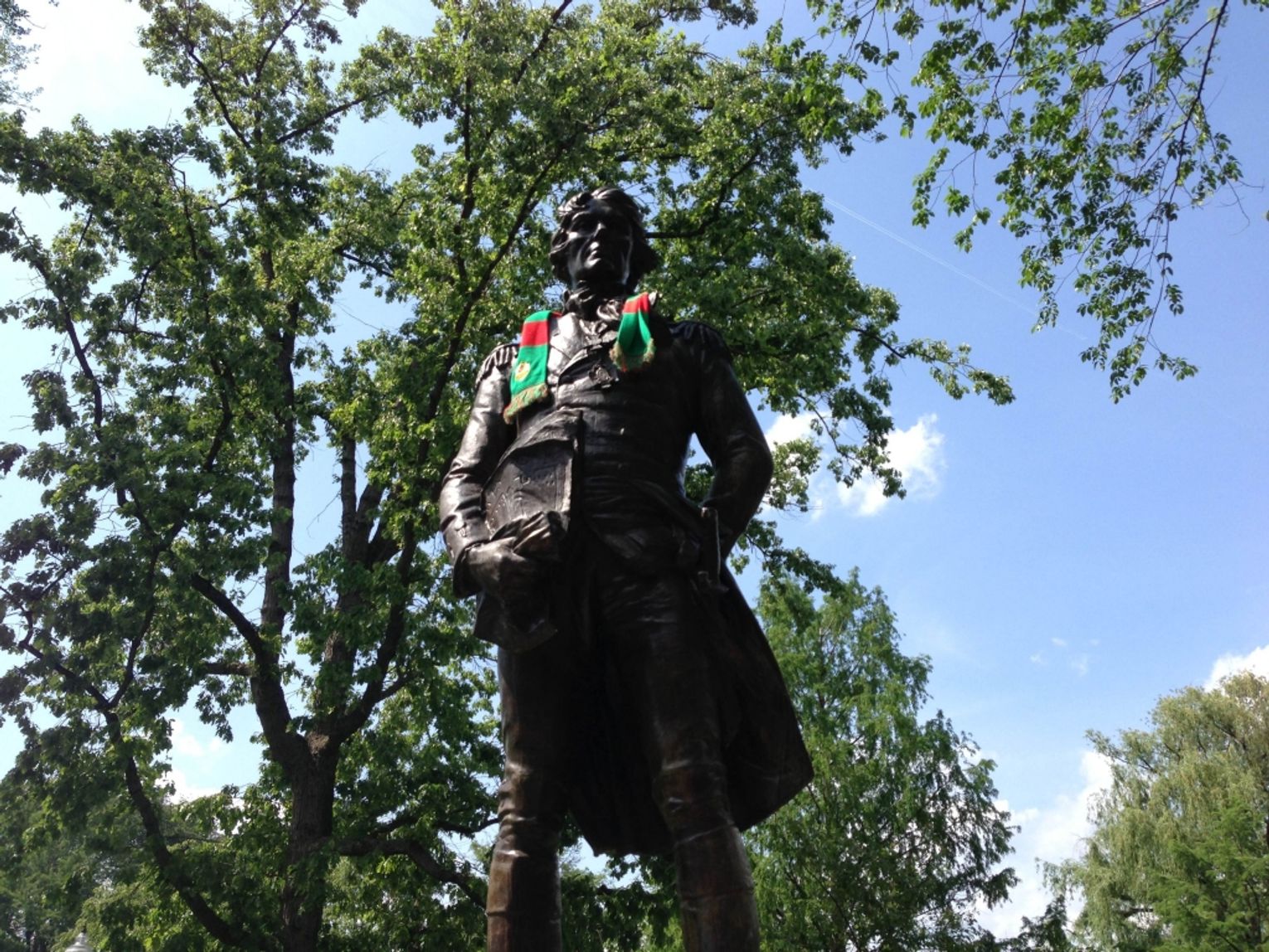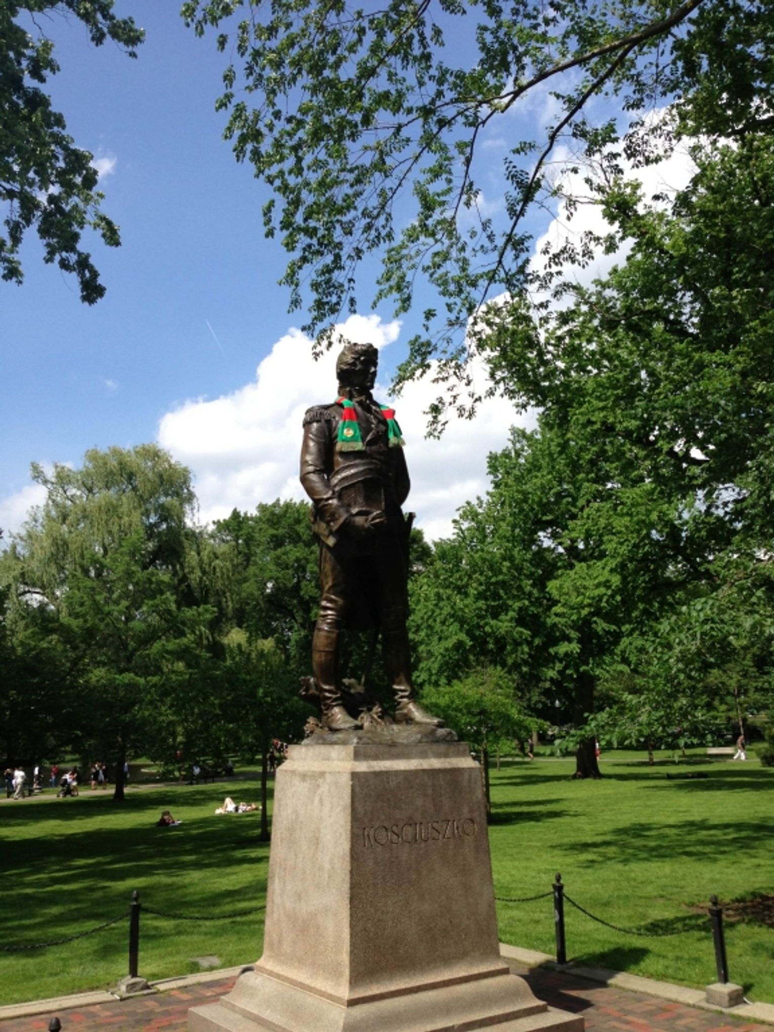 Jest taki zwyczaj w Hiszpanii, że kibice Realu Madryt po każdym zwycięskim meczu dekorują szalikiem z barwami swojej drużyny pomnik swojej królowej. Kibice Legii Warszawa, mimo że może się to wydawać nieprawdopodobne udekorowali niegdyś szalikiem Zygmunta III Wazę. A przecież i my moglibyśmy nawiązać do podobnego zwyczaju, zawieszając szaliki na postumencie Tadeusza Kościuszki na placu jego imienia. Bohater to w naszej historii zacny a i przyjaciołom naszym zza Oceanu mocno się przysłużył. Szaliczek, jako wyraz lokalnego patriotyzmu zapewne by mu nie przeszkadzał, tak jak nie straszna mu była rogatywka kosynierów. Podobno Zarząd Lechii wystąpił kiedyś oficjalnie do władz miasta o zgodę na dekorowanie Naczelnika. Niestety jej nie otrzymał. Jednak, jak mówi porzekadło: dla chcącego nic trudnego. Pomników naszego bohatera nie brakuje, podobnie jak nie brak jest ludzi dobrej woli. Krótka podróż w Internecie wystarczyła, by znaleźć figurę odpowiednich rozmiarów i kształtu w… Bostonie. Szybko znaleźli się też ludzie, którzy zadeklarowali, że ją udekorują po wygranym przez naszych piłkarzy meczu barwami tomaszowskiego klubu i ten fakt udokumentują fotografią. Słowa dotrzymali, wygraliśmy wczoraj Puchar a postument Tadeusza Kościuszki w amerykańskim mieście otrzymał czerwono – zielone barwy. Prawda, że dumnie je nosi?