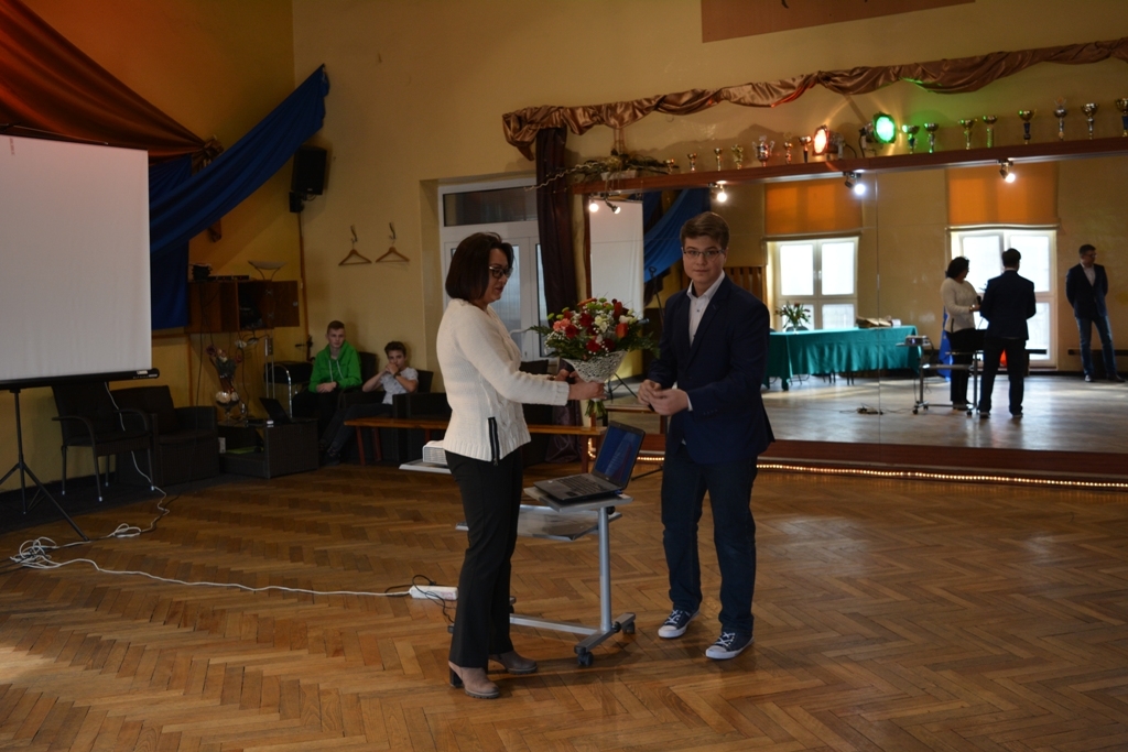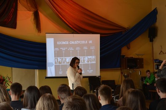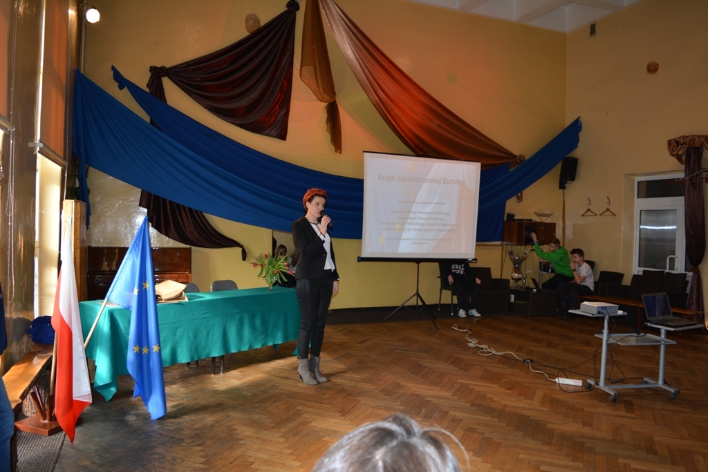 Ciekawą prezentację multimedialną na temat funkcjonowania Unii Europejskiej i Parlamentu Europejskiego przedstawiła Agata Roksela z Biura Poselskiego Jacka Saryusz Wolskiego, która razem z dyrektorem szkoły Anetą Jarząbek wręczyła nagrody laureatom konkursu.