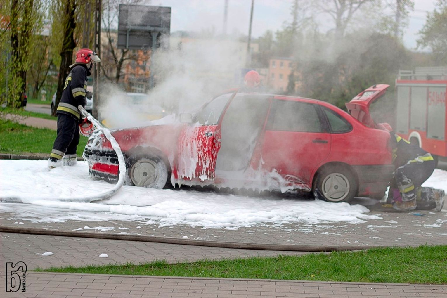 Zapewne wielu z Was zastanawiało się w minioną sobotę skąd tak duża ilość piany pochodzącej ze strażackich gaśnic znalazła się na odcinku ulicy Nowowiejskiej w okolicach stadionu Lechii. Okazuje się, że na miejscu była ekipa Blank Studio, która sfilmowała akcję gaszenia płonącego samochodu marki Seat. Z pojazdu niewiele zostało.