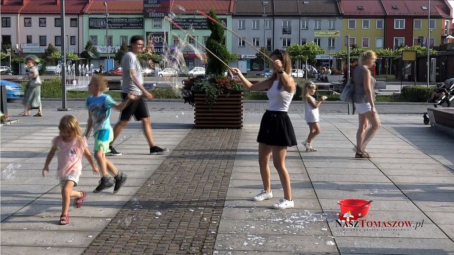 Paulina Rek, instruktor MCK-u robiła gigantyczne bańki mydlane. W kolejny piątkowy wieczór plac Kościuszki rozbrzmiewał muzyką i głośnym śmiechem dzieci bawiących się z instruktorami Miejskiego Centrum Kultury.