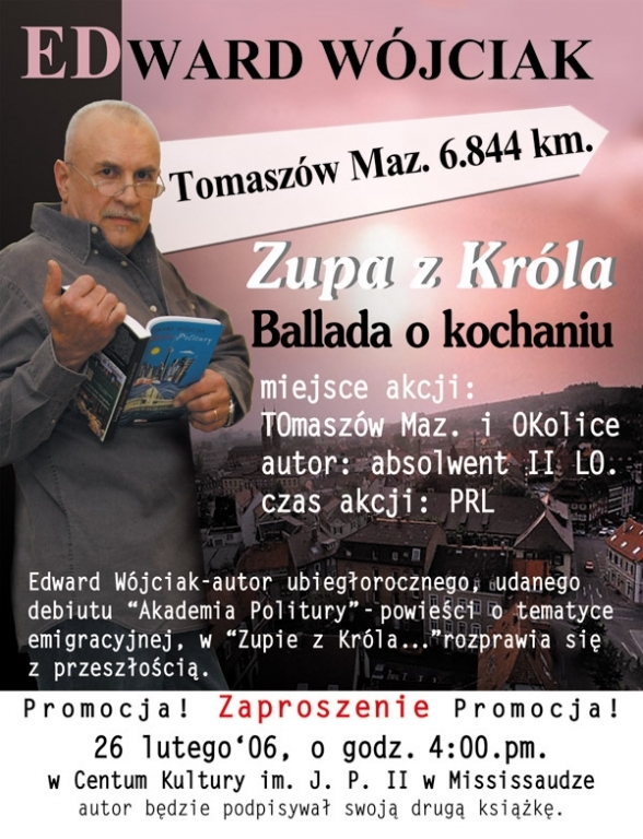 A szefem Klubu był mój znajomy sprzed lat, który mi spadł jakby z nieba (znowu ten sam, od Herosów, Antek Malewski). Nie mogłem wtedy nawet przypuszczać, jak jego talenty organizacyjne pomogą mi wypromować się w Polsce. W ciągu tygodnia Antek Malewski nie dosyć, że pomógł nam zorganizować promocję i zaprosił mnie na dwa spotkania, to jeszcze jakimś cudem załatwił mi wywiad, przeprowadzony ze mną przez ówczesną znaną prezenterkę Monikę Jóźwik w Telewizji Polonia. Wystarczyło dziewięć minut na wizji i cały świat Polonii dowiedział się, że Edek Wójciak wydał w Kanadzie dwie książki. Nie bez znaczenia była też recenzja tej znanej telewizyjnej postaci, która miała na przeczytanie moich knyp niespełna dwa dni. Przyznała, że Akademię zaliczyła w całości i bardzo ją urzekła, ale Zupę ledwie „przeleciała”, ale i tak nie szczędziła jej pochwał na wizji. Wystarczyło. Po powrocie do Kanady w Centrum Kultury im. Jana Pawła II zaczęli zaczepiać mnie ludzie, mówiąc: „a ja pana widziałem (widziałam) w telewizji”. Magia czwartej władzy zaczęła zbierać żniwo