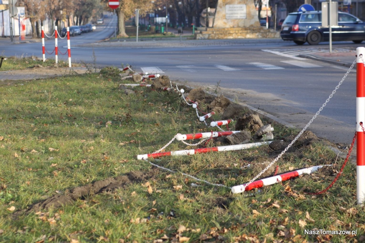 Od czasu do czasu (niestety nazbyt często) mamy możliwość publikować efekty wyczynów tomaszowskich kretynów. Tym razem naszym rodzimym idiotom przeszkadzały słupki i łańcuchy zabezpieczające skrzyżowanie obok gimnazjum numer 3 przy rondzie przy ulicy Legionów. Czy rzeczywiście odsetek głupków, przypadających na każdy 1000 mieszkańców musi być u nas wyższy niż w innych, podobnych do naszego, miastach?