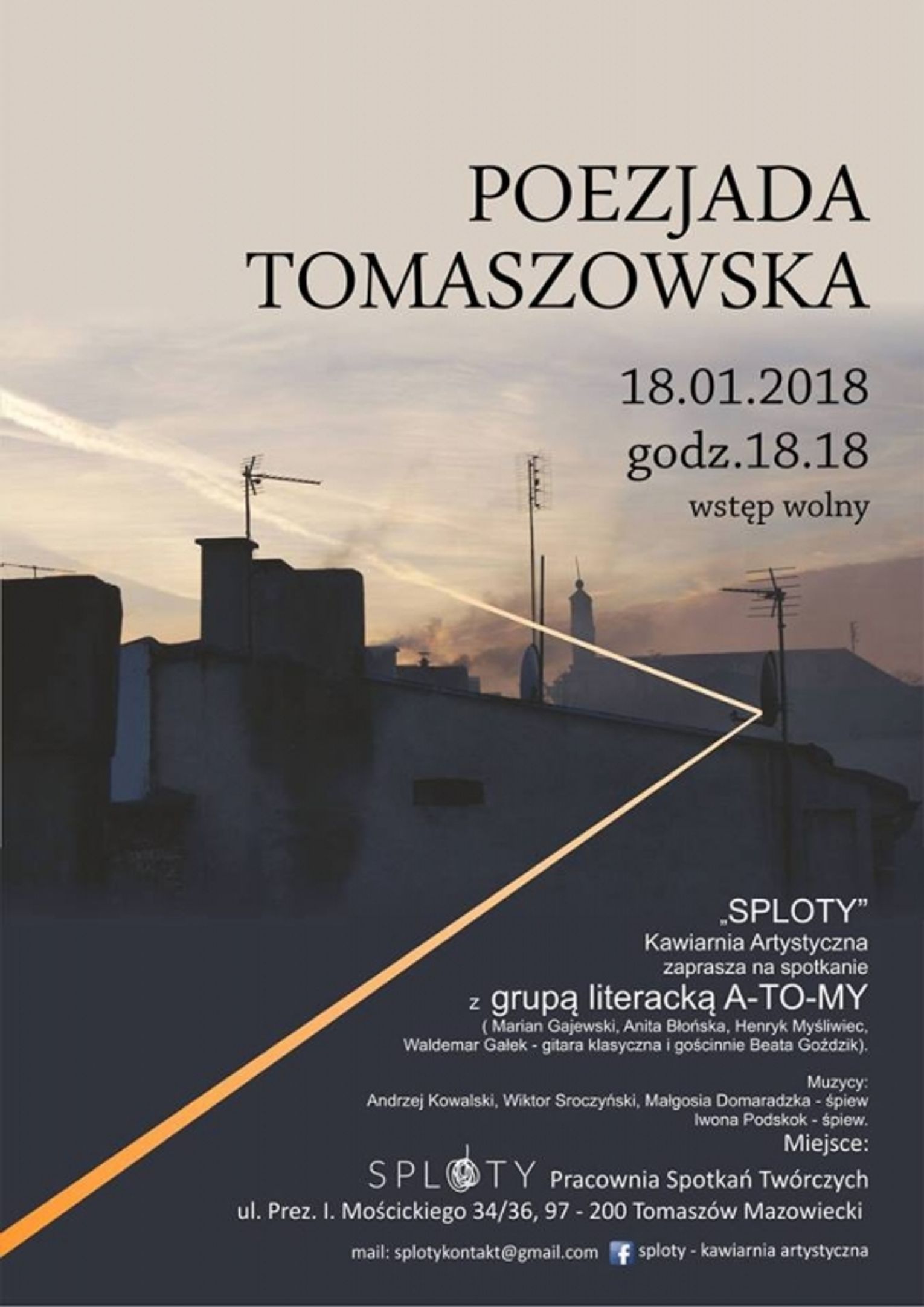 Kawiarnia Artystyczna "Sploty" zaprasza w czwartek, 18 stycznia 2018 roku o godzinie 18.18, na spotkanie z grupą literacką A-TO-MY (Marian Gajewski, Anita Błońska, Henryk Myśliwiec, Waldemar Gałek - gitara klasyczna i gościnnie Beata Goździk).
