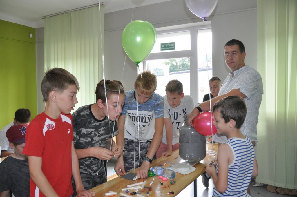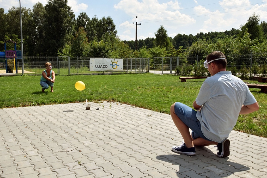 24 lipca rozpoczęły się zajęcia w ramach warsztatów wakacyjnych Z UJAZDU W KOSMOS. Projekt zakładał zorganizowanie cyklu spotkań, których efektem było przeprowadzenie eksperymentu naukowego- wysłanie balonu do stratosfery i pomiar wartości temperatury powietrza na dużych wysokościach. Grupa dzieci i młodzieży z Ujazdu i okolic uczestnicząca w warsztatach zdobywała wiedzę na temat baloniarstwa w Polsce i na świecie, poszerzała informacje na temat praw fizycznych wykorzystywanych podczas lotu balonu oraz systemów namierzania obiektów. Uczestnicy konstruowali balony solarne, badali właściwości gazów: wodoru, tlenku węgla (VI) i helu w celu wybrania najwłaściwszego, który uniesie nasz balon jak najwyżej. Były wybuchy, próby wypuszczenia w powietrze różnych statków powietrznych: lampionów, balonów napełnionych wodorem, helem i gorącym powietrzem. Na zajęcia przyjęli zaproszenie radiowcy z Tomaszowa Mazowieckiego, którzy opowiedzieli o swoim hobby oraz pochwalili się zdobyczami w postaci sond meteorologicznych namierzonych i odnalezionych dzięki systemom radiowym.