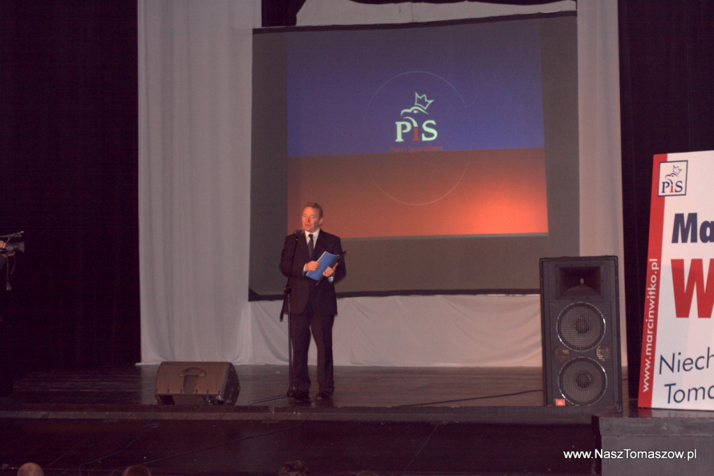 Jako następny głos zabrał Janusz Wojciechowski, który na scenę wszedł z dokumentem opatrzonym logiem Najwyższej Izby Kontroli. – Tu jest dramatyczny bilans otwarcia, z jakim przystępujemy do tych wyborów – mówił pokazując raport z kontroli NIK w Tomaszowie. – Miasto Tomaszów Mazowiecki nie miało szczęścia do poprzednich rządów. Tutaj brakowało Prawa i Sprawiedliwości w sensie partii politycznej ale brakowało też prawa i sprawiedliwości w takim codziennym działaniu poprzednich władz miasta. Tak drastycznych nieprawidłowości, jakie zdarzyły się w Tomaszowie to naprawdę trudno jest znaleźć. To są rzeczy, których wyjaśnieniem zajmuje się obecnie prokuratura ale to jest również obniżenie szans dla tego miasta. Jest człowiek, który jako radny rzucił wyzwanie tym nieprawidłowościom. Tym człowiekiem jest Marcin witko, najlepszy kandydat na prezydenta Tomaszowa Mazowieckiego. – dodał. Poseł podkreślał też, że Witko jest jego rekomendacją numer jeden – Pracujemy razem od kilku lat. Na początku w ramach PSL-u a teraz PiS.
