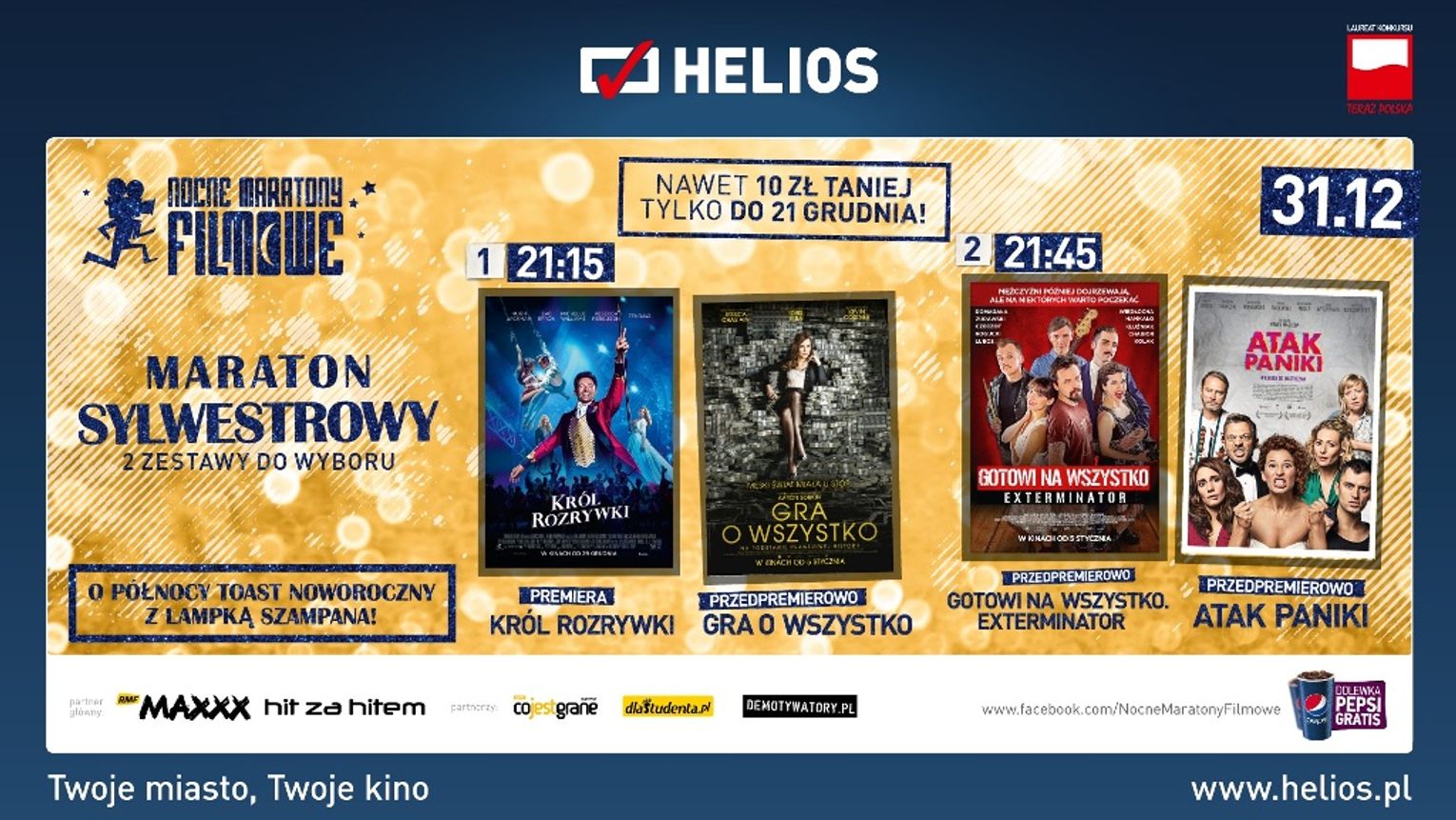 Do każdego biletu na NMF w kasie kina dołączony będzie kupon uprawniający do jednorazowej dolewki napoju w kubku (Pepsi, Mirinda, 7up, Ice Tea), sprzedawanego w barze kina Helios. Kupon ważny tylko w czasie NMF.