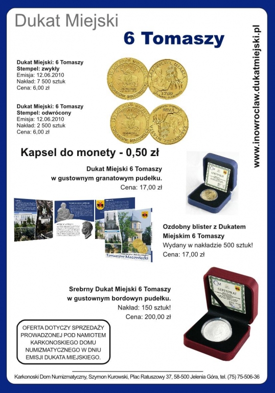 Uroczyste wprowadzenie do obiegu 6 Tomaszy rozpocznie organizator akcji – Karkonoski Dom Numizmatyczny – w swoim namiocie na tomaszowskim Placu Kościuszki w godz. od 10.00 do 15.00.