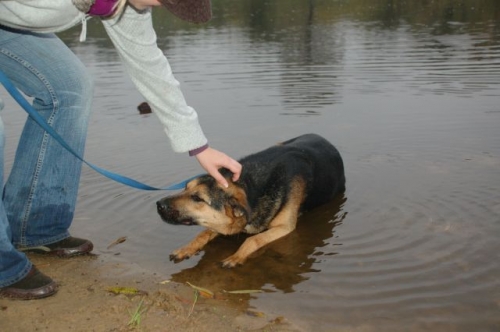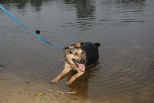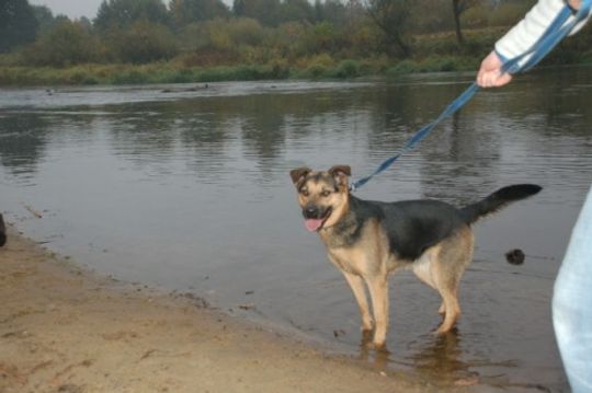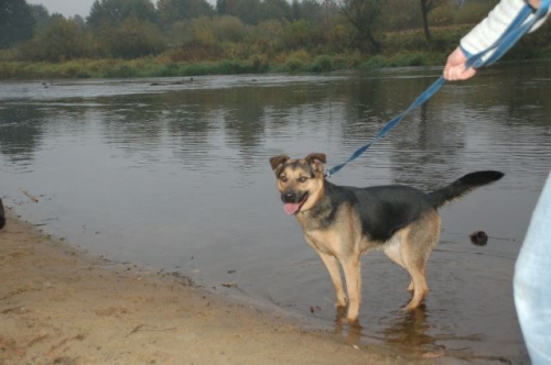Wychodzimy. Mijają kolejne minuty spaceru, a Pola jest coraz weselsza. Z ciekawością rozgląda się dookoła, wszystko ją interesuje. Wszystko musi obwąchać i poznać. Nawet zimne wody Pilicy nie były jej straszne. Od razu widać, że to pies, który lubi dużo ruchu. Po jakimś czasie ustąpił też lęk przed obcymi ludźmi.