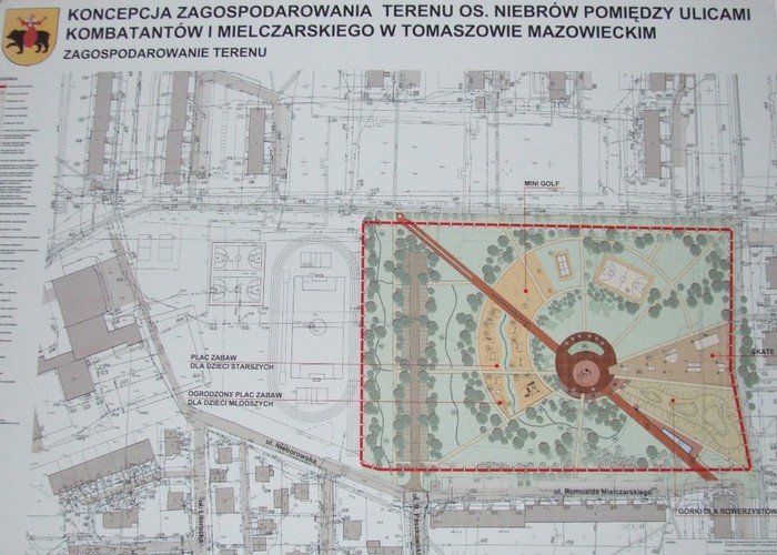 Przygotowano również plastyczny projekt zagospodarowania części osiedla Niebrów. Ładnie to rzeczywiście wyglądało. Zrealizowane nie będzie. Zamiast tego powstanie nowa siedziba Domu Kultury TKACZ.