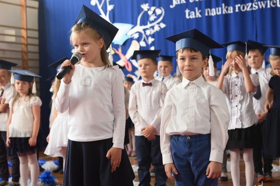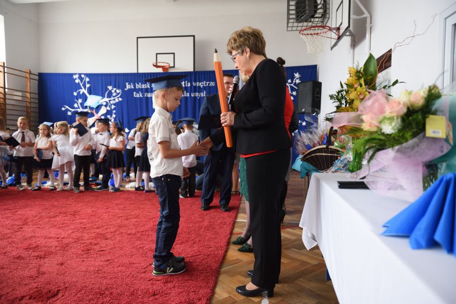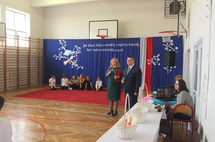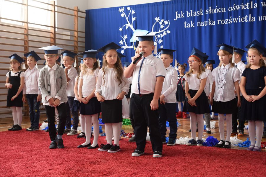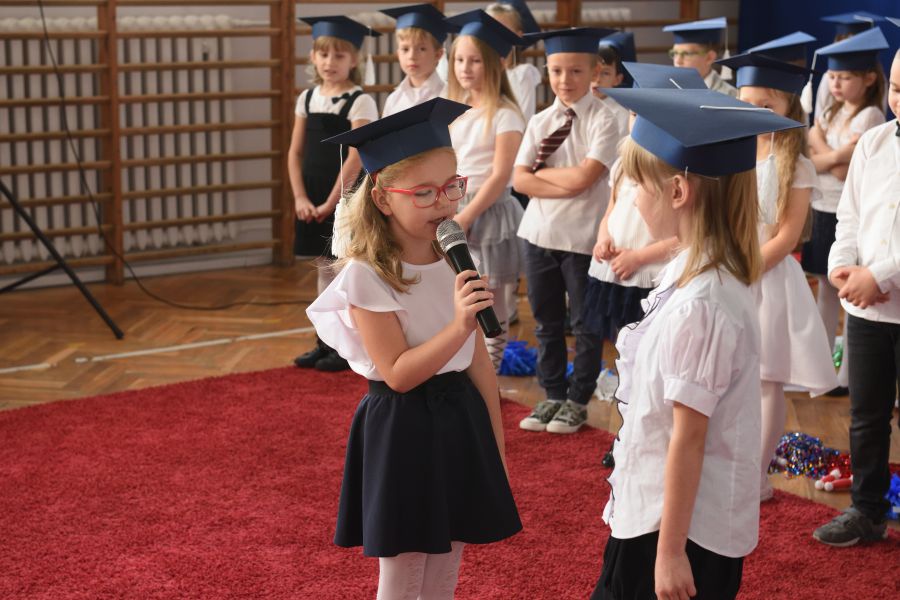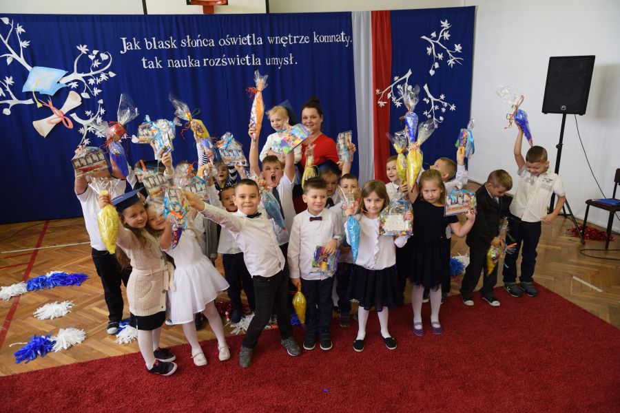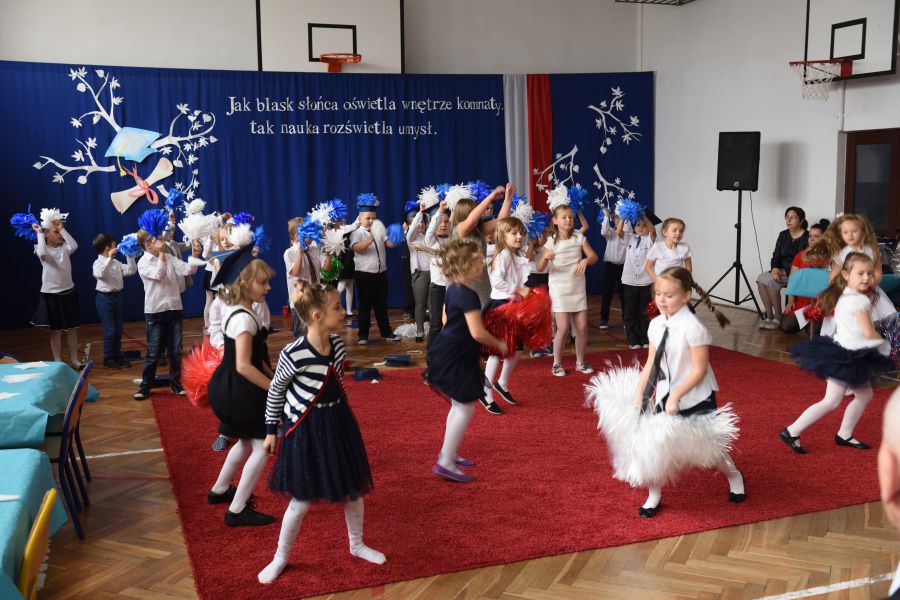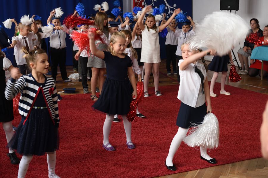 Nie zabrakło też gości, była Dyrektor Wydziału Edukacji H. Szczucińska, radny K. Kuchta, ks. Z. Nitecki – proboszcz parafii NMPKP oraz rodzice, prawni opiekunowie, dziadkowie i rodzeństwo pierwszaków. Na początek Dyrektor Szkoły pani Izabela Śliwińska skierowała do uczniów ciepłe słowa. Następnie uczniowie zaprezentowali program artystyczny. Mimo dużej tremy uroczystość przebiegła prawidłowo.
