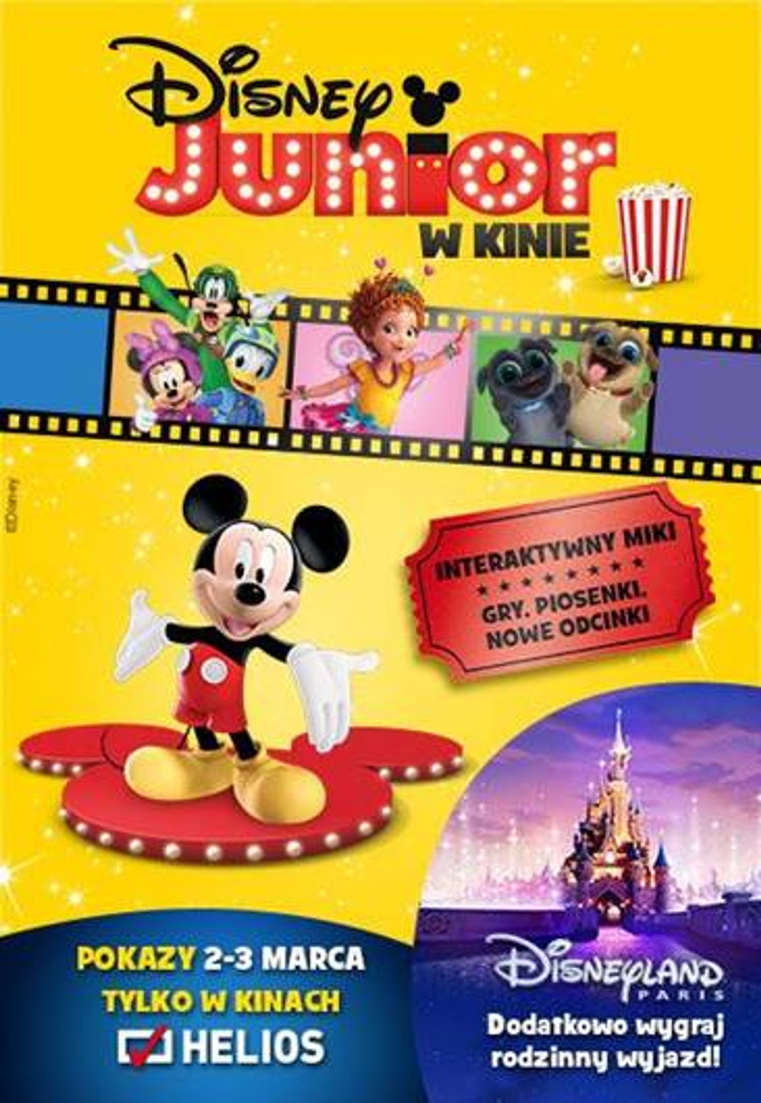 Już 2 i 3 marca zapraszamy na czwartą edycję pokazów „Disney Junior w kinie”. Na wielkim ekranie pojawią się ulubieni bohaterowie seriali Disney Junior: „Miki i raźni rajdowcy”, „Fancy Nancy Clancy”, „Bingo i Rolly w akcji”, „Vampirina” i „Mapeciątka”. Miki, jako interaktywny prowadzący zaprosi widzów do wspólnej zabawy w grach, tańczenia przy serialowych piosenkach i wspólnego oglądania trzech premierowych, nieemitowanych wcześniej w telewizji odcinków seriali. Dołączcie do ulubionych bohaterów Disney Junior i przeżyjcie wspólnie kolejne niezapomniane przygody! Zapraszamy na wspaniałe wrażenia filmowe oraz wspólną zabawę połączoną z edukacją.Podczas każdego pokazu masz szansę wziąć udział w konkursie i wygrać bon o wartości 100 zł na zakupy obuwia z licencji Disneya w sklepach CCC. Fantastyczną zabawę dopełnia możliwość wygrania rodzinnego wyjazdu do Disneyland® Paris. Pakiet stanowiący nagrodę obejmuje 2 noclegi w trzygwiazdkowym tematycznym Hotelu Disneya® dla maksymalnie 4 osób oraz bilety wstępu do 2 Parków Disneya i kupony na jedzenie w trakcie całego pobytu.