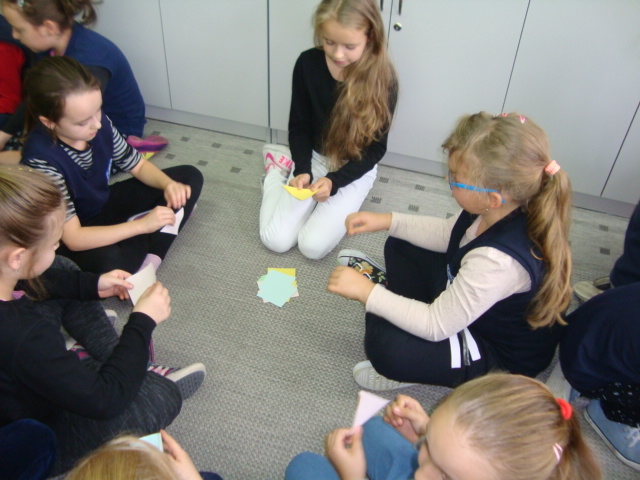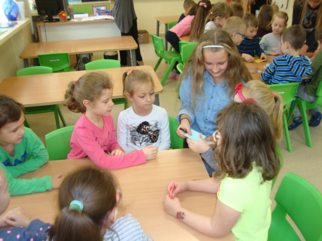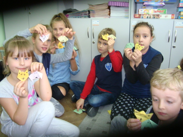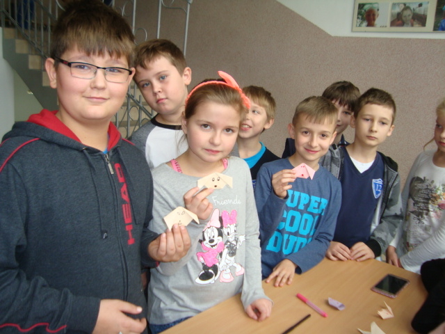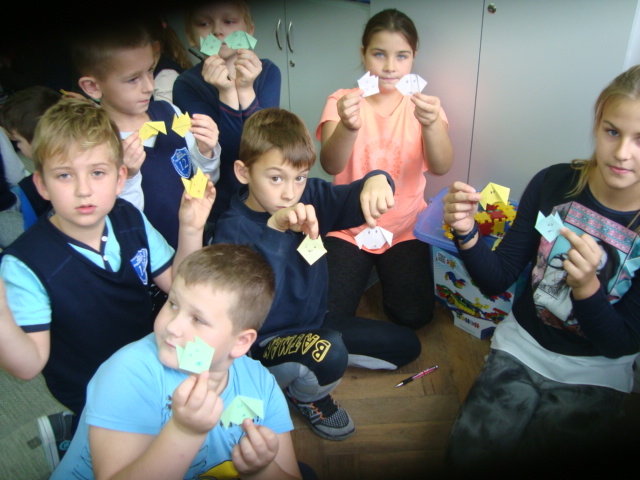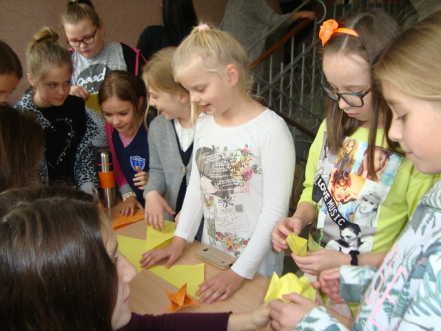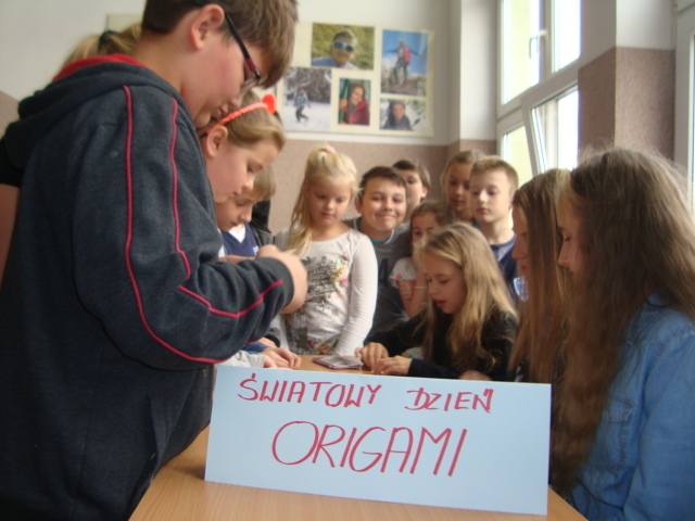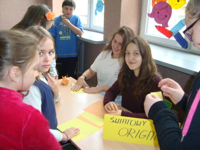 Tego dnia na szkolnych korytarzach przedstawiciele Samorządu Uczniowskiego SP 12 uczyli chętnych uczniów wykonania zwierzątek z Orgiami. Pani Daria Witulska, opiekunka Samorządu, opowiadała bajkę i ilustrowała ją elementami Origami. Uczennice klasy 5c uczyły sztuki Origami przedszkolaków z Tęczowej Akademii, uczniów klas I-III oraz dzieci z Przedszkola nr 7.