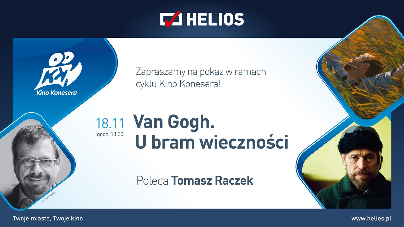 Najnowszy film Juliana Schnabla to zmysłowa opowieść o najbardziej owocnym i zarazem najbardziej dramatycznym okresie życia Vincenta Van Gogha (Willem Dafoe). Malarz szuka nowego miejsca do życia. Za namową przyjaciela wyjeżdża z Paryża do Arles w Prowansji. Tam, zafascynowany feerią barw i grą światła, niedoceniany artysta tworzy swoje najsłynniejsze obrazy. Tam też, błąkając się po malowniczych polach, niosąc sztalugę, pędzle i farby, stopniowo popada w obłęd, a przy tym zyskuje pewność, że sensem jego życia jest sztuka. Film odkrywa tajemnicę jego zagadkowej śmierci i przedstawia jako człowieka z krwi i kości, pełnego sprzeczności, wspieranego przez ukochanego brata i przyjaciela Paula Gauguina, z którym pod koniec życia popadł w śmiertelny konflikt. Opowiada o człowieku, który godzi się z własnym przeznaczeniem i wbrew wszelkim przeszkodom do końca idzie swoją ścieżką. W doborowej obsadzie znaleźli się Mads Mikkelsen, Emmanuelle Seigner, Oscar Isaac i Rupert Friend. Willem Dafoe w głównej roli stworzył najwybitniejszą kreację w swojej karierze. Nie tyle zagrał Van Gogha, co się nim stał, za co zasłużenie otrzymał nagrodę dla najlepszego aktora na festiwalu w Wenecji i nominację do Oscara.