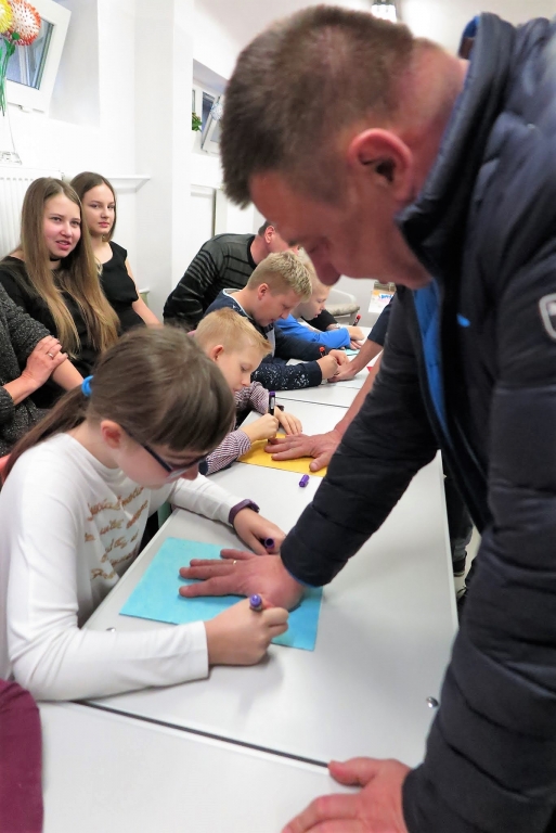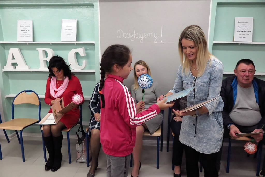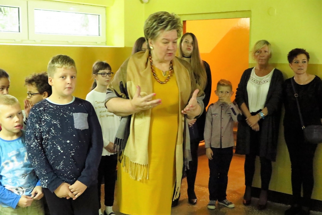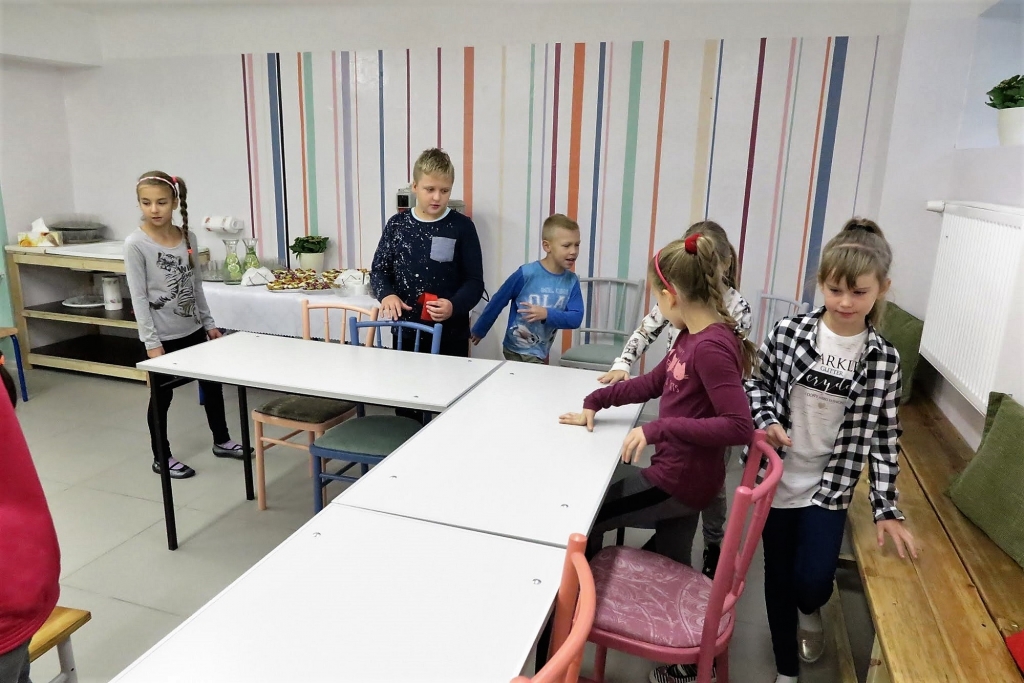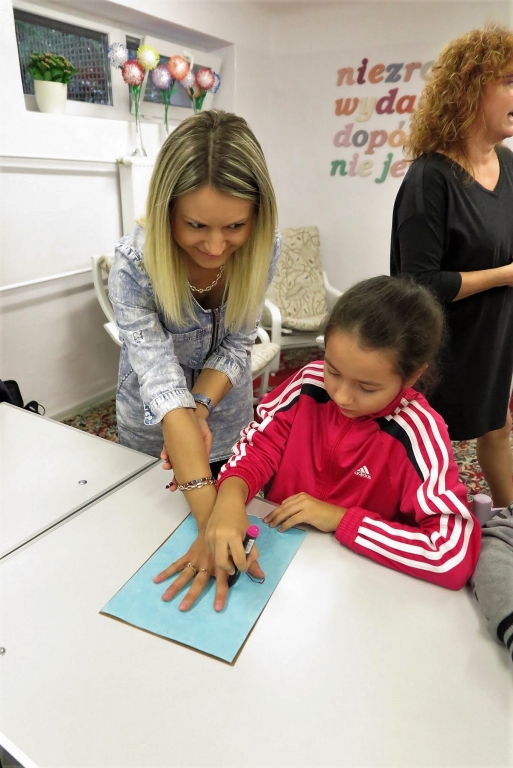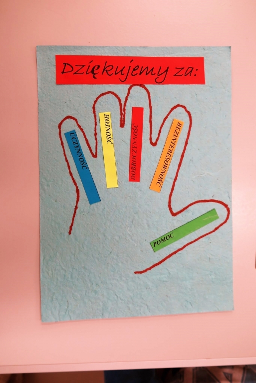 Goście byli świadkami pierwszych w nowej świetlicy zajęć, których treść krążyła wokół tematu bezinteresownej pomocy. Efektem dziecięcych działań były prace plastyczne wykonywane z udziałem gości. Pani dyrektor Wacława Bąk, kończąc spotkanie, wyraziła serdeczne podziękowania.