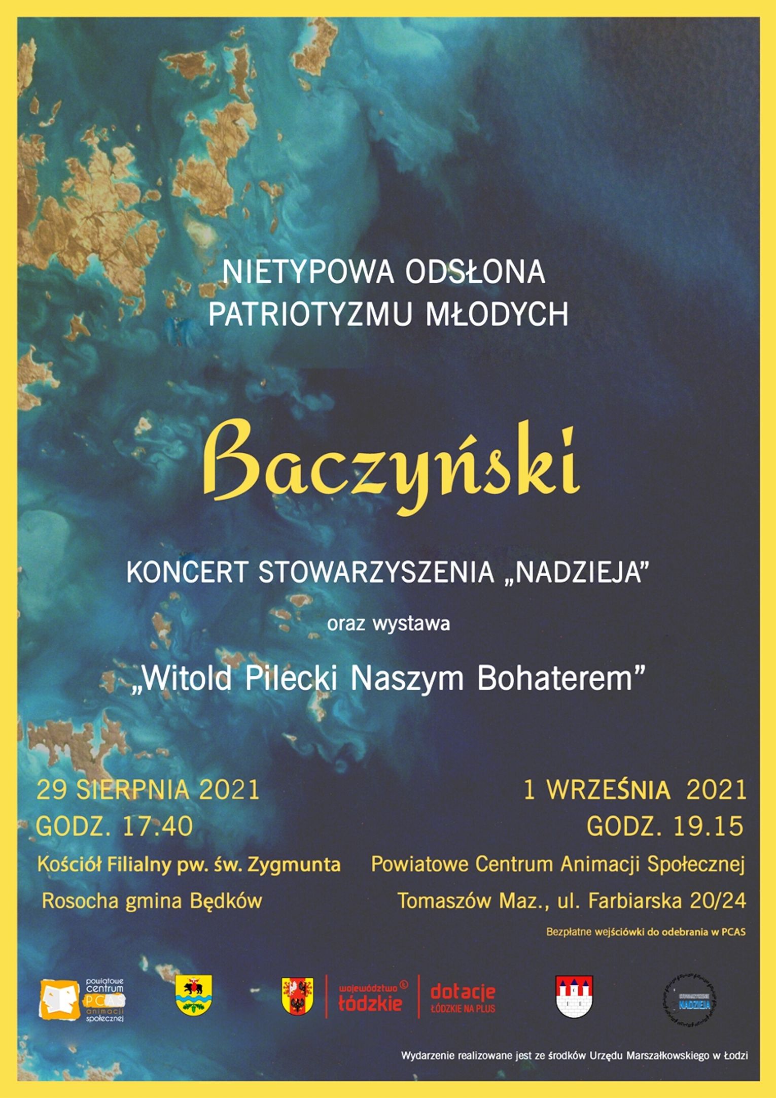 Projekt zakłada organizację dwóch koncertów, których inspiracją będzie twórczość Krzysztofa Kamila Baczyńskiego oraz wystawy poświęconej rotmistrzowi Witoldowi Pileckiemu. Koncerty będą organizowane zgodnie z obowiązującym reżimem sanitarnym. Bezpłatne wejściówki na koncert w PCAS-ie będą dostępne w sekretariacie placówki od środy, 25 sierpnia.