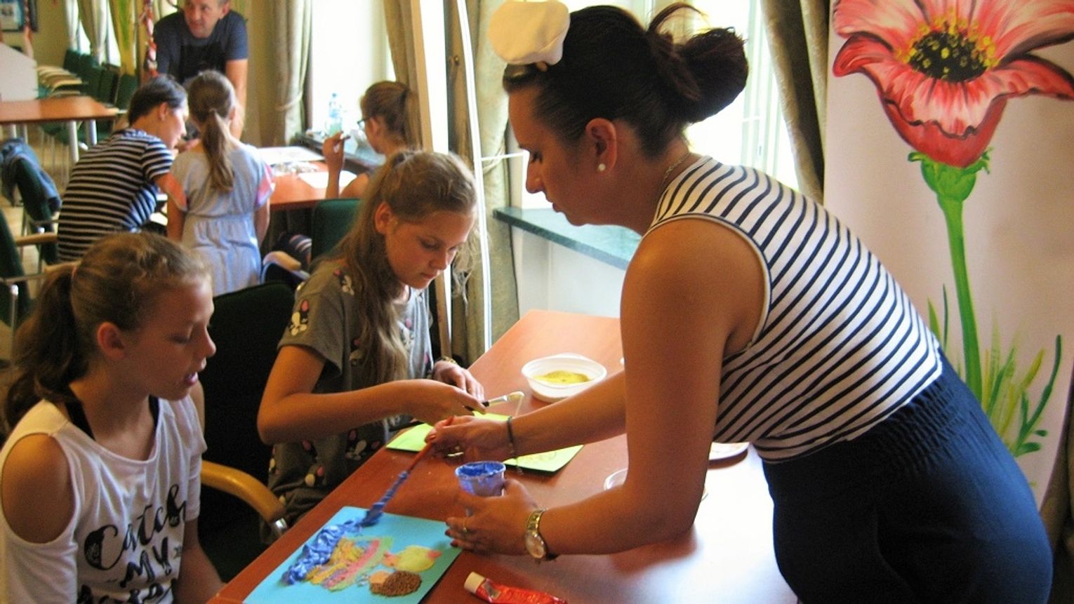 Dzieci wraz z rodzicami chętnie wzięły udział w kreatywnej zabawie. Uczestnicy spotkania mieli okazję poznać różnorodne techniki plastyczne. Katarzyna Wojtaszczyk z Miejskiego Centrum Kultury zachęciła najmłodszych uczestników warsztatów do wykonania jadalnego kolażu. Powstałe prace 3D nawiązywały do wakacyjnych podróży. Sam kącik dla małych artystów zdobiły żeglarskie akcesoria. Pod okiem pani Kasi już od września dzieci mogą odkrywać swoje plastyczne talenty w filii „Tkacz”.