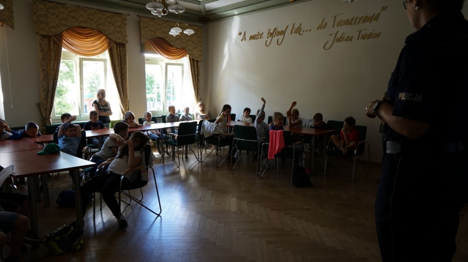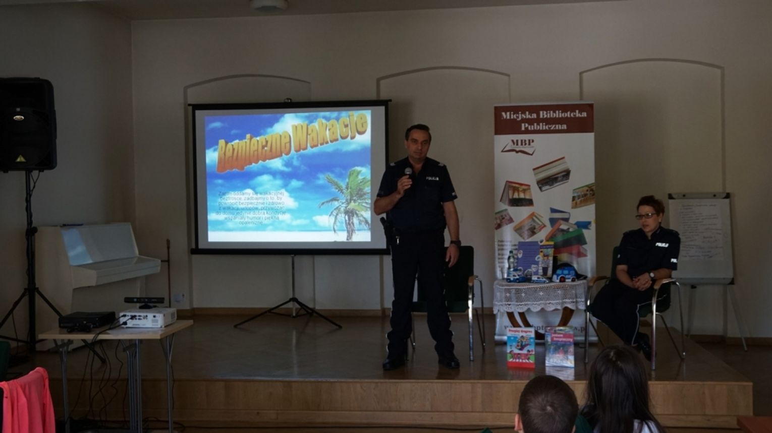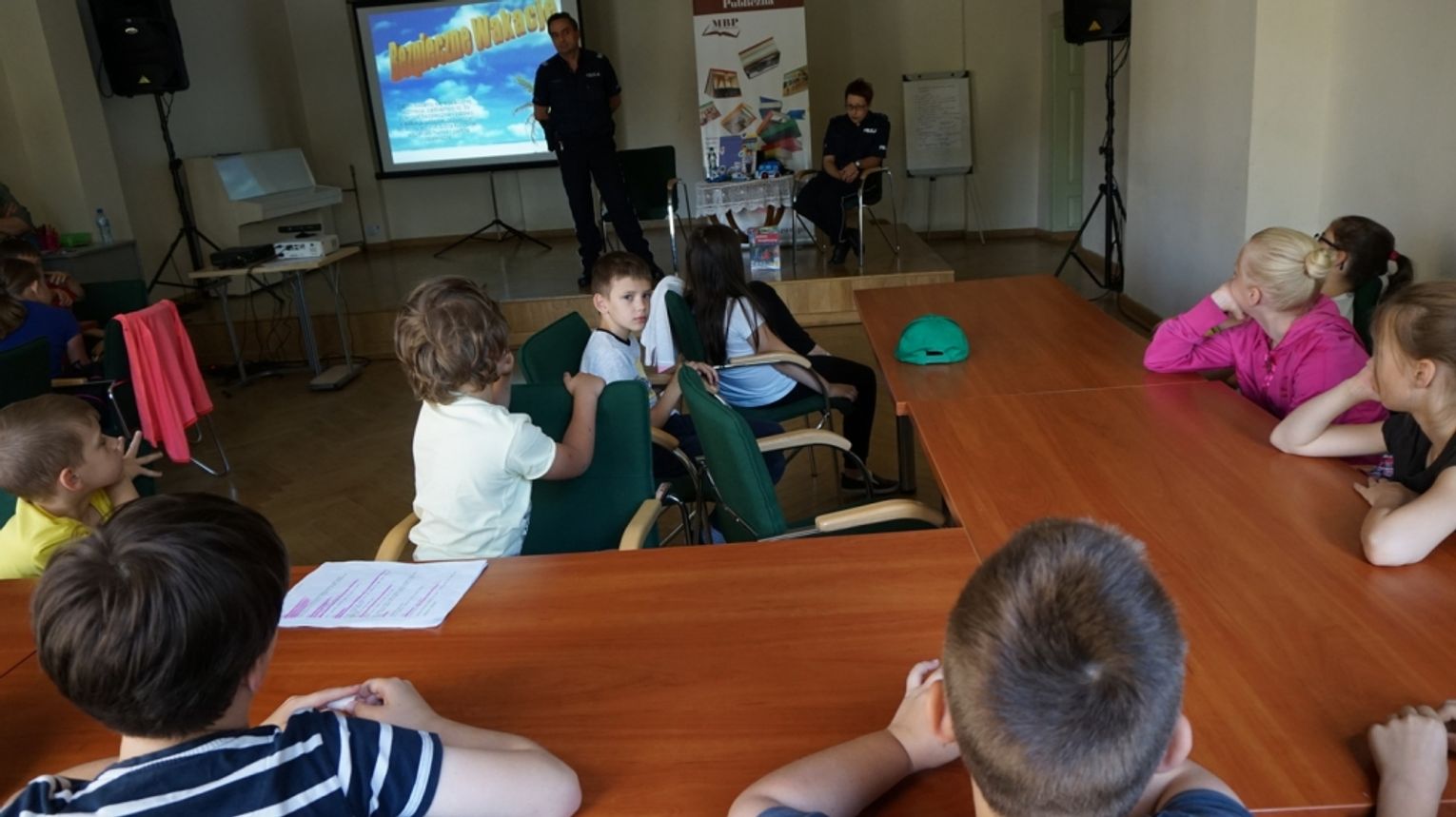 Przedostatni, czwarty dzień został zatytułowany „Bezpieczne odpoczywanie”. Bibliotekę odwiedzili policjanci z Komendy Powiatowej Policji w Tomaszowie Mazowieckim: młodszy aspirant Pani Joanna Besztak oraz sierżant sztabowy Pan Grzegorz Kołodziejski. Zaproszeni goście porozmawiali z dziećmi o tym, jak zachowywać się, aby wakacje były bezpiecznym czasem, czy to na drodze, nad wodą, czy nawet w domu. Najmłodsi otrzymali broszury z numerami telefonów alarmowych, które warto znać, planując wakacje. Następnie odbyła się lekcja biblioteczna na temat bezpiecznego spędzania czasu wolnego. Dzieci obejrzały ciekawą prezentację multimedialną i wysłuchały wskazówek, które gwarantują pozbawiony ryzyka wypoczynek. Wykonały również czapki z papieru z napisem: bezpieczne wakacje oraz wzięły udział w zabawie podsumowującej zajęcia.