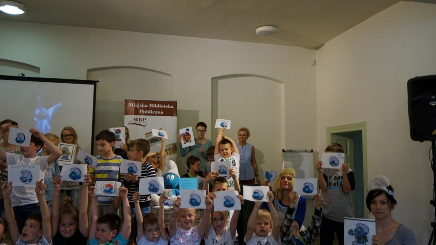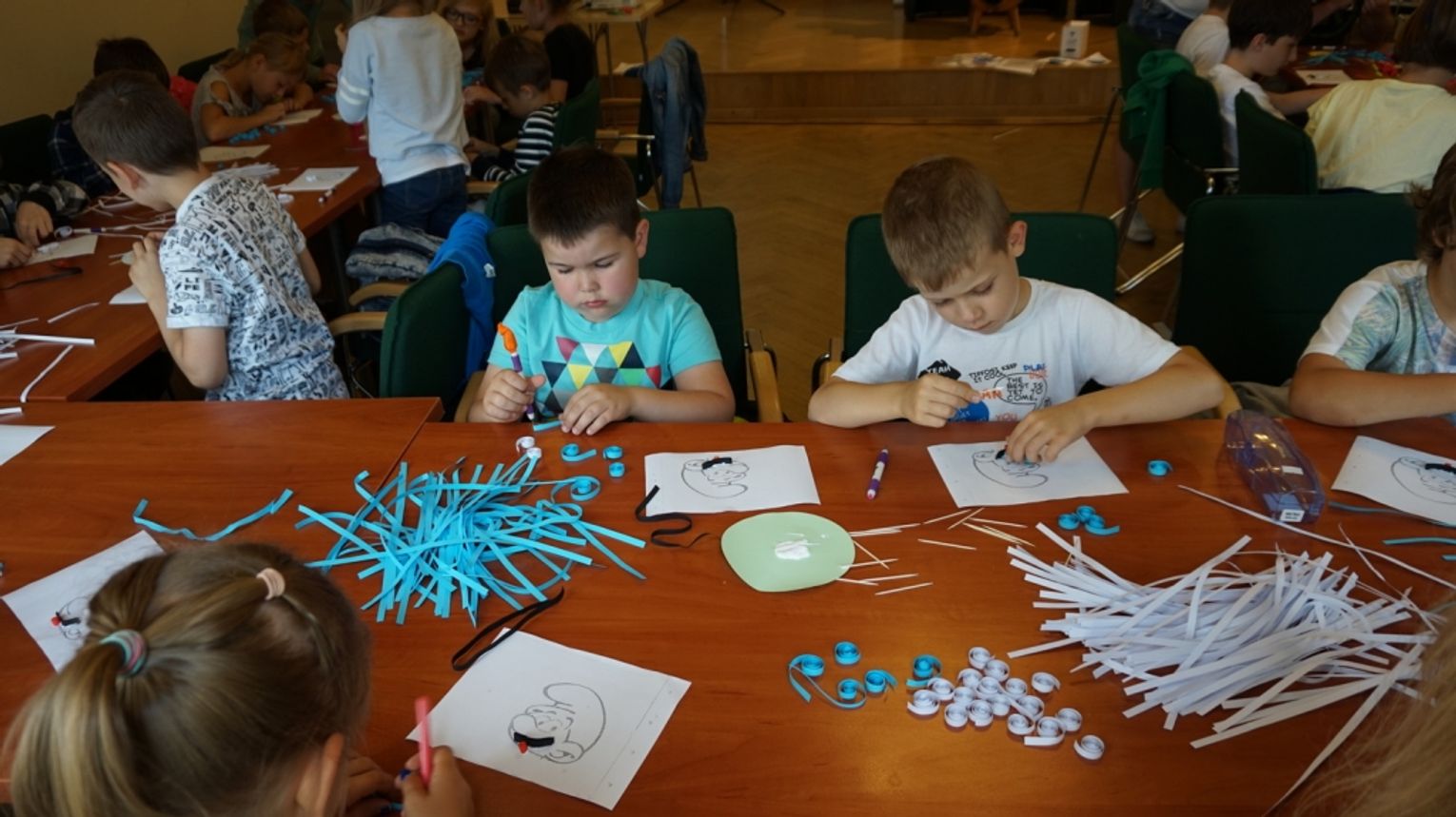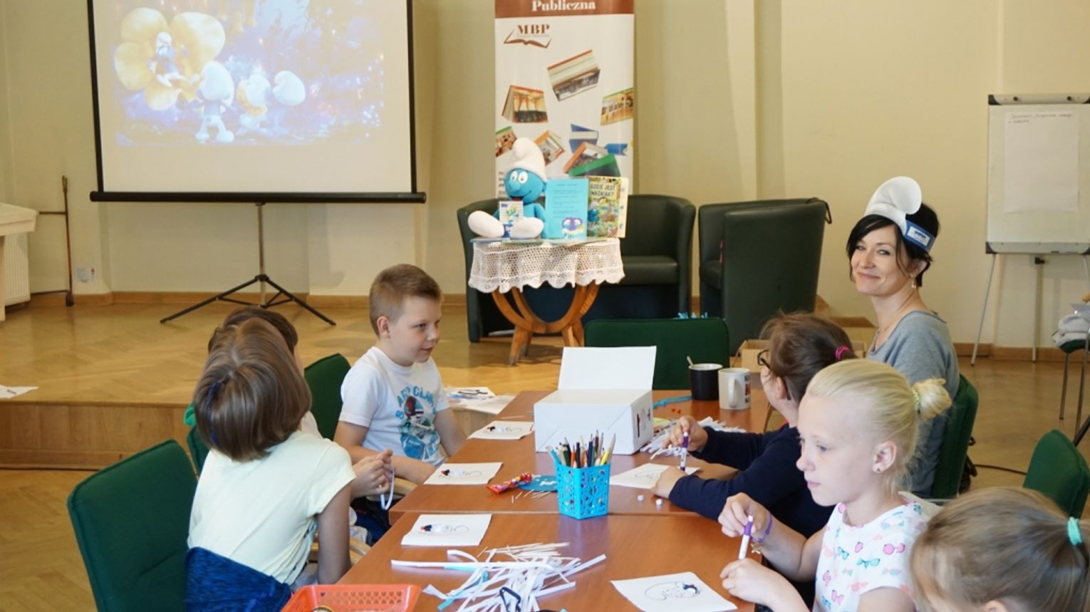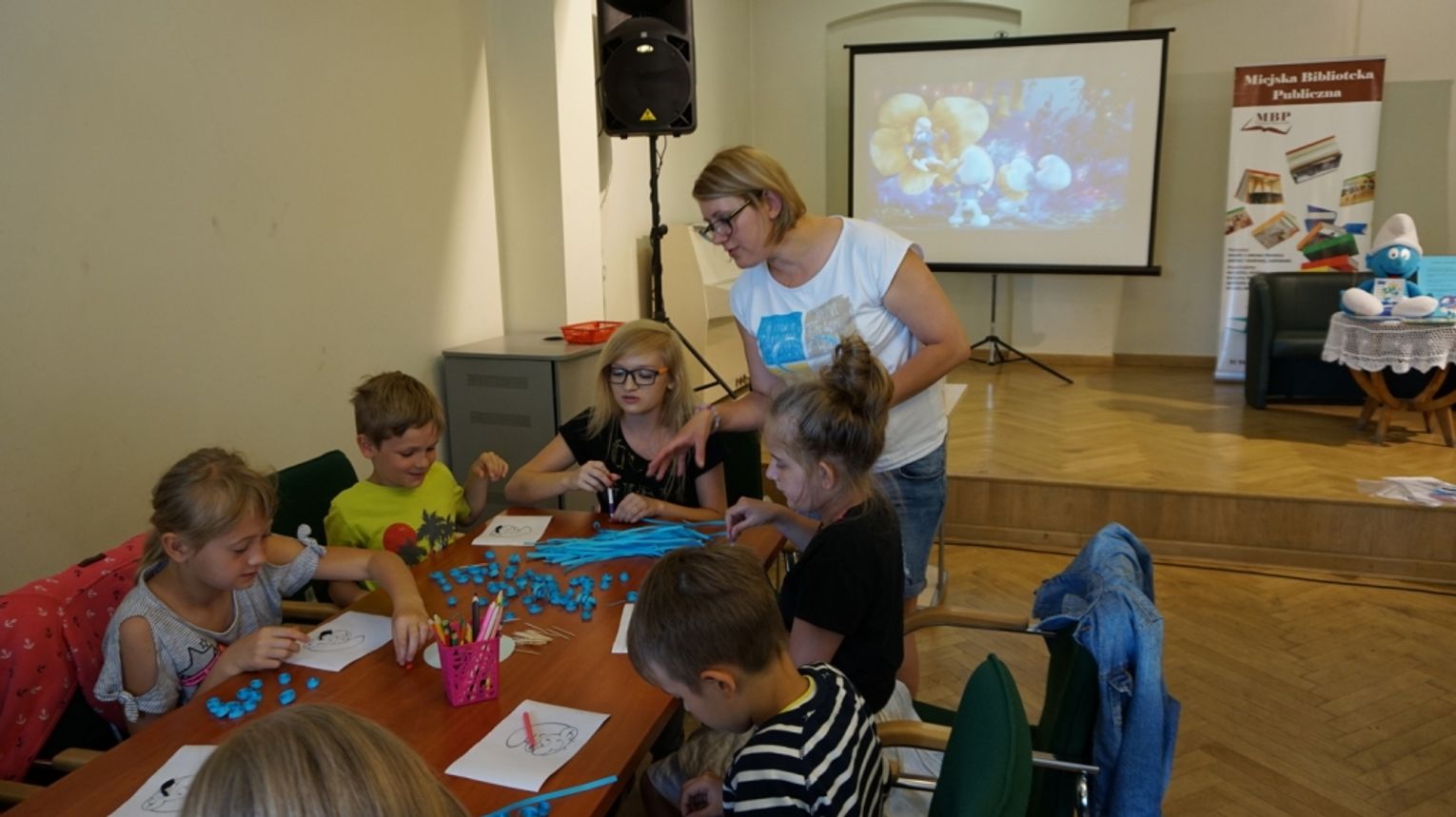 Pierwszy dzień zatytułowany jako „Smerfny” rozpoczęliśmy od zapoznania uczestników z programem i regulaminem letnich warsztatów bibliotecznych oraz od spisania wakacyjnego kontraktu z dziećmi. Następnie nasza czytelniczka Pani Lidia Borkowska przeprowadziła warsztaty plastyczne z wykorzystaniem techniki quillingu. Najmłodsi wykonali portrety niebieskich ulubieńców dzieci. Kolejnym punktem były zajęcia w języku angielskim, które odbyły się dzięki uprzejmości Pani Martyny Węglewskiej ze Studia Helen Doron. Nasi podopieczni uczyli się o kolorach tęczy - śpiewając piosenkę. Budowali zdania opisujące czynności barwnych smerfów. Dzieci utrwaliły także słownictwo związane z różnymi dyscyplinami sportowymi. Zajęciom przyświecało przesłanie: Nauka poprzez zabawę. W tym dniu nie zabrakło smerfnego czytania z udziałem najmłodszych, rebusów i zabaw.