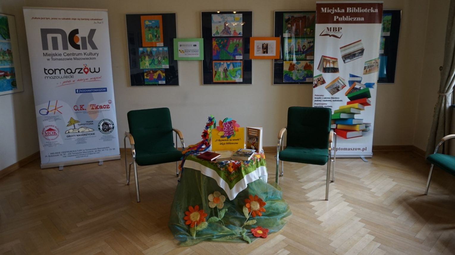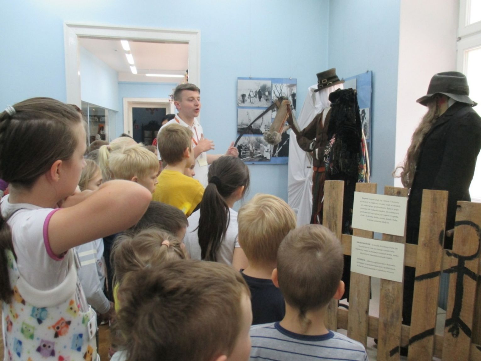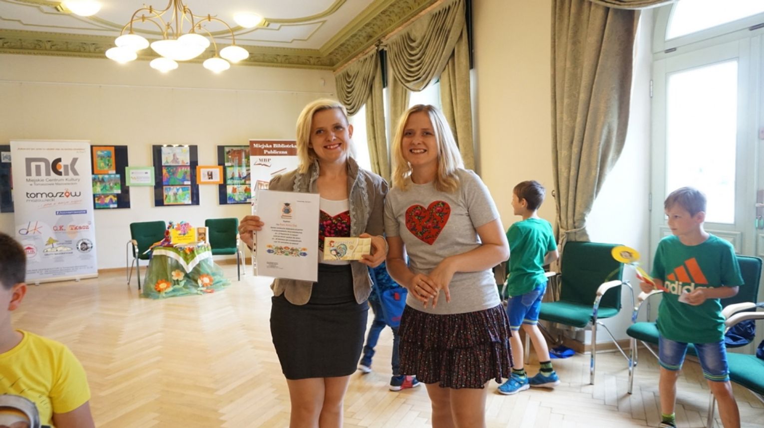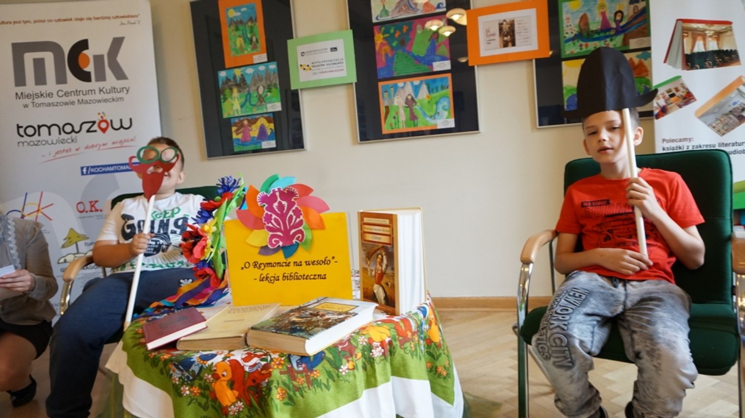 Drugi dzień nazwany został: „Z folklorem za pan brat”. Ciekawostki o życiu i twórczości Władysława Stanisława Reymonta poznali uczestnicy projektu pn. „Kolej” na Reymonta, którego organizatorami jest Łódzki Dom Kultury i Miejskie Centrum Kultury. Partnerem realizowanego 4 lipca br. zadania była Miejska Biblioteka Publiczna w Tomaszowie Mazowieckim. Lekcję biblioteczną pn. „O Reymoncie na wesoło” rozpoczęto zabawą - wywiadem z noblistą. Dzieci wsiadły do pociągu na stacji Czarnocin Wolbórka, gdzie pracował Reymont. Nie zabrakło zabawy nawiązującej do „Chłopów”, do powieści ukazującej życie społeczności zamieszkującej wieś Lipce na przestrzeni czterech pór roku. Na koniec dzieci otrzymały pamiątkowe medale z wizerunkiem Reymonta. Później zachęciliśmy je do robienia z masy solnej folklorystycznych figurek: kogucików. Punktem, na który wszyscy czekali, była wycieczka do Muzeum im. Antoniego hr. Ostrowskiego. Głównym celem była wystawa etnograficzna. Dzieci wysłuchały ciekawych informacji od opiekuna działu Pana Michała Adama Pająka. Przedstawiona ekspozycja prezentuje rok z życia mieszkańców podtomaszowskich wsi z przełomu XIX i XX wieku i tak jak w „Chłopach” Reymonta opowiada o ich codziennych zajęciach w domu, polu i zagrodzie oraz prezentuje akcesoria towarzyszące najciekawszym zwyczajom skupionym wokół obchodzonym w naszej kulturze świętom: Bożego Narodzenia czy Wielkanocy itp. Dzieci chłonęły wiedzę i zadawały wiele pytań.
