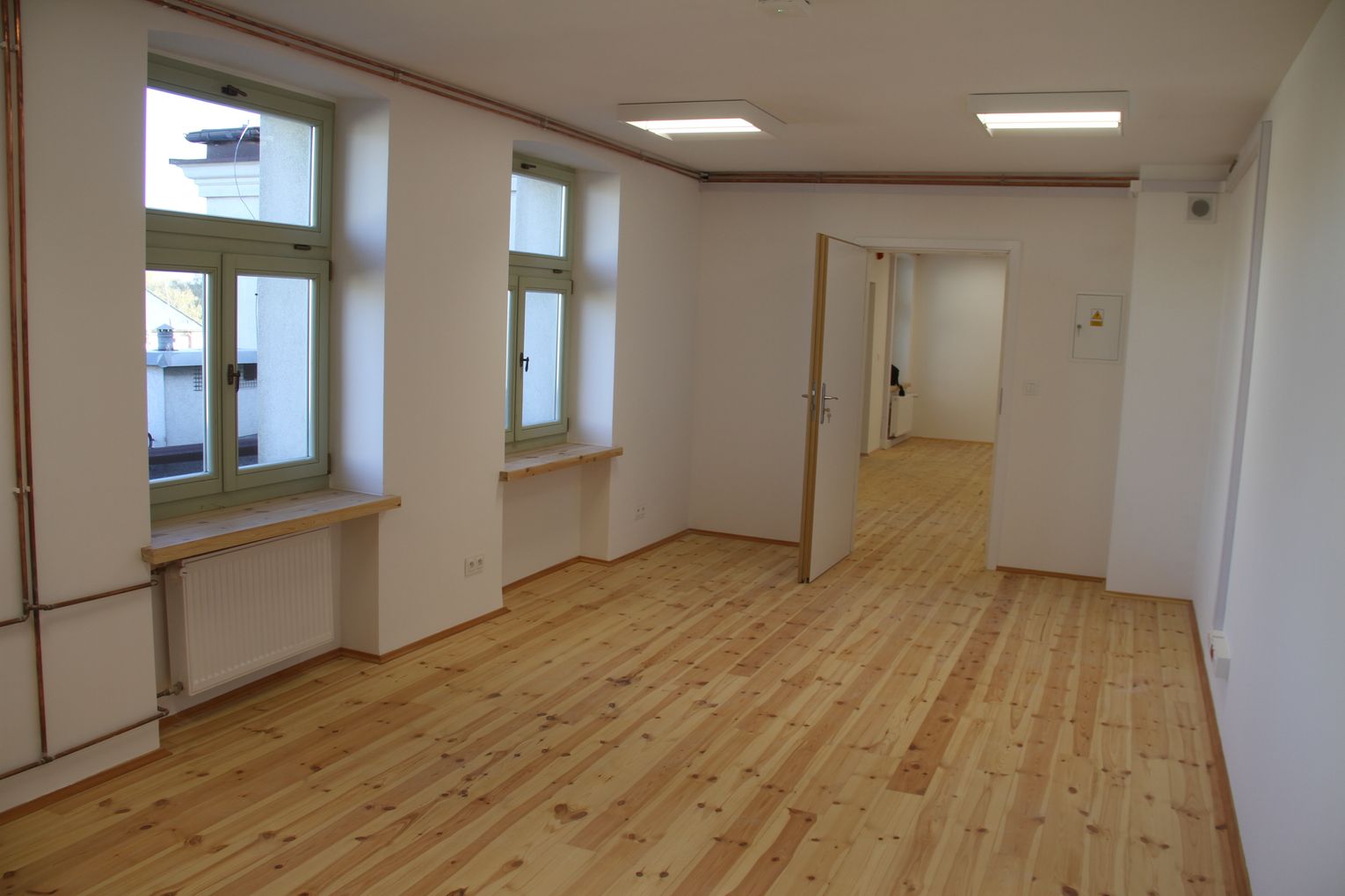 Wykonano także nowe stropy nad użytkowymi pomieszczeniami poddasza, na którym wykonano nowe ścianki działowe typu lekkiego na konstrukcji szkieletowej, a tym samym zbudowano nowy rozkład pomieszczeń. W pomieszczeniach rozebrano stare podłogi i wykonano nowe wraz z posadzkami na poddaszu oraz nowymi warstwami podłogowymi w piwnicy pod budynkiem głównym.