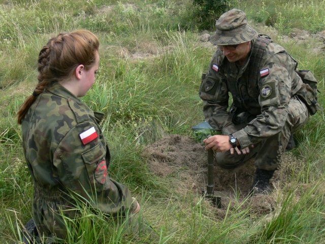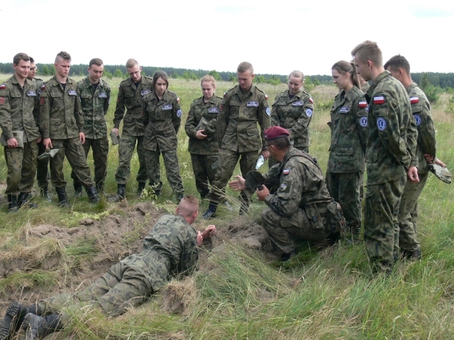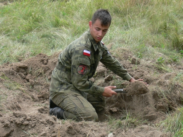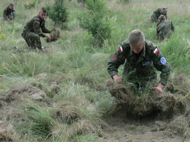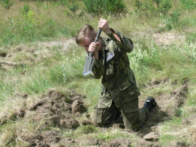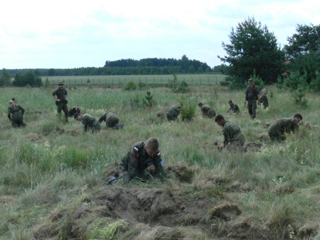 Uczniowie wykonywali pojedynczy okop strzelecki do strzelania w postawie leżącej w postaci wykopu o szerokości 60 cm, długości 170 cm i głębokości 30 cm. Czas przewidziany na budowę takiego okopu wynosi od 25-35 min. Pomimo niedogodności terenowych oraz konieczności wykonywania wykopu w pozycji leżąc, uczniowie bardzo dobrze poradzili sobie z zadaniem.