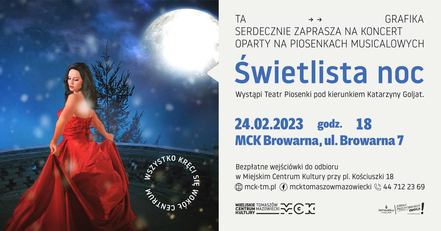 Bezpłatne wejściówki na wydarzenie można odbierać w sekretariacie Miejskiego Centrum Kultury przy pl. Kościuszki 18 (do wyczerpania limitu miejsc). Zapraszamy.