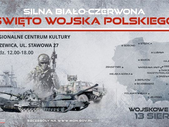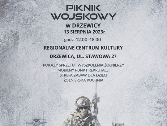 13 sierpnia w Drzewicy przy Regionalnym Centrum Kultury przy ul. Stawowej 27 wystąpi i zagra koncert Orkiestra Wojskowa z Dęblina, będzie można pooglądać repliki broni oraz postrzelać na strzelnicy wirtualnej z Mroczkowa Gościnnego, a także porozmawiać z uczniami klas mundurowych. Zaprezentowany będzie pokaz udzielania pierwszej pomocy
