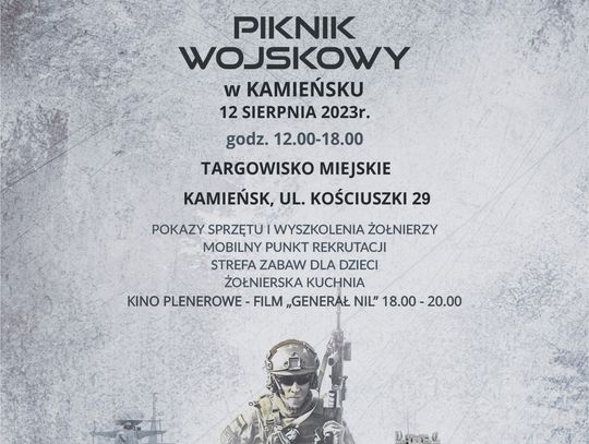12 sierpnia w Kamieńsku na terenie Targowiska Miejskiego przy ul. Kościuszki 29 będzie można dodatkowo min. sprawdzić swoje umiejętności posługiwania się bronią dzięki nowo otwartej strzelnicy wirtualnej przy ZSP im. Tadeusza Kościuszki, posmakować lokalnych specjałów, a na zakończenie pikniku, o godzinie 18.00, w ramach „Kina Frontowego” obejrzeć film „Generał Nil”. W pikniku weźmie udział młodzieżowa Orkiestra Dęta przy OSP w Kamieńsku. Zapoznać się będzie można z zasadami udzielania pierwszej pomocy.