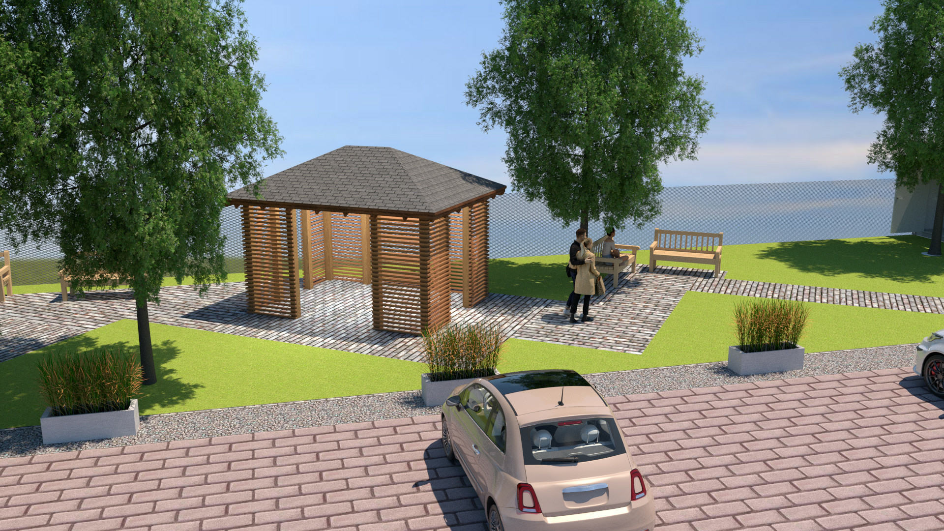 Na skwerze znajdą się wygodne ławeczki, powstanie również drewniana altanka z zadaszeniem i miejscami siedzącymi do odpoczynku.