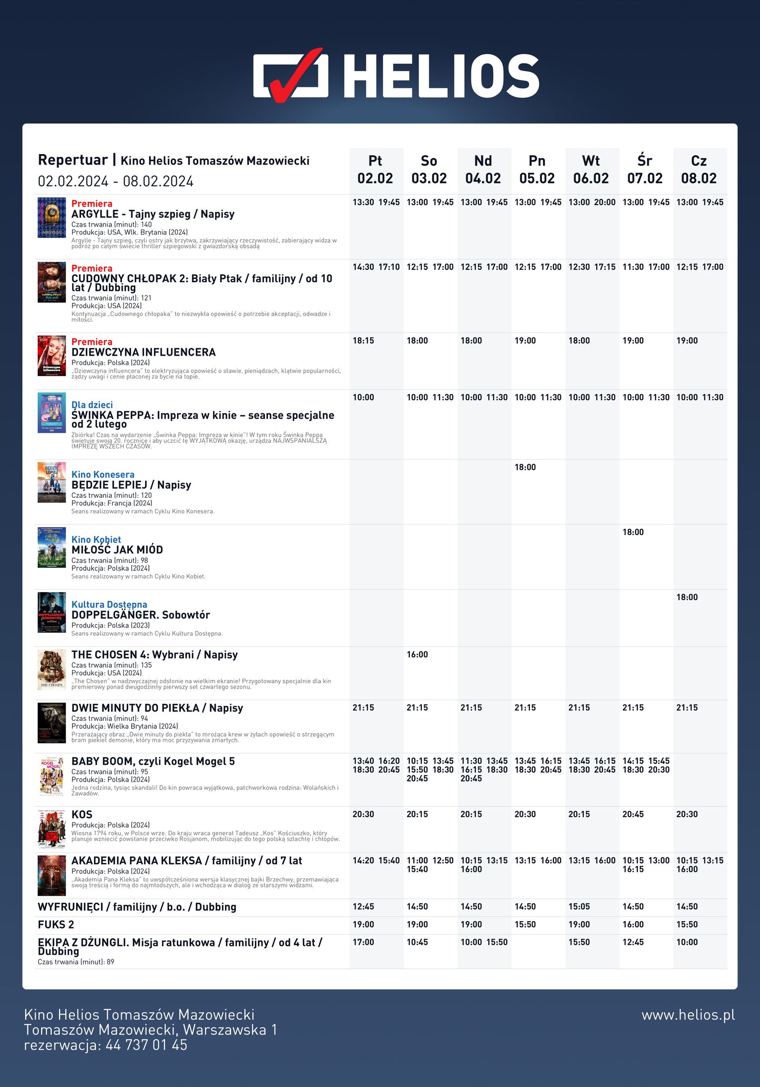 Szczegóły dotyczące wszystkich seansów w aktualnym repertuarze można znaleźć na stronie www.helios.pl, w aplikacji mobilnej oraz w kasach kinowych sieci. Dokonując zakupu wcześniej, można wybrać najlepsze miejsca, a także – zaoszczędzić.
