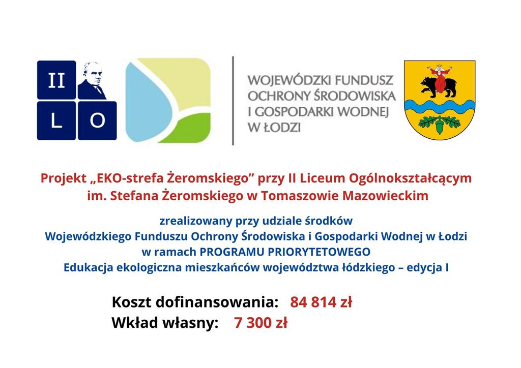 Kilka miesięcy temu szkoła otrzymała dofinansowanie w formie dotacji, w wysokości 84 814 zł na realizację zadania: "EKO-strefa Żeromskiego" przy II Liceum Ogólnokształcącym im. Stefana Żeromskiego w Tomaszowie Mazowieckim, w ramach Programu Priorytetowego "Edukacja ekologiczna mieszkańców województwa łódzkiego – edycja I".