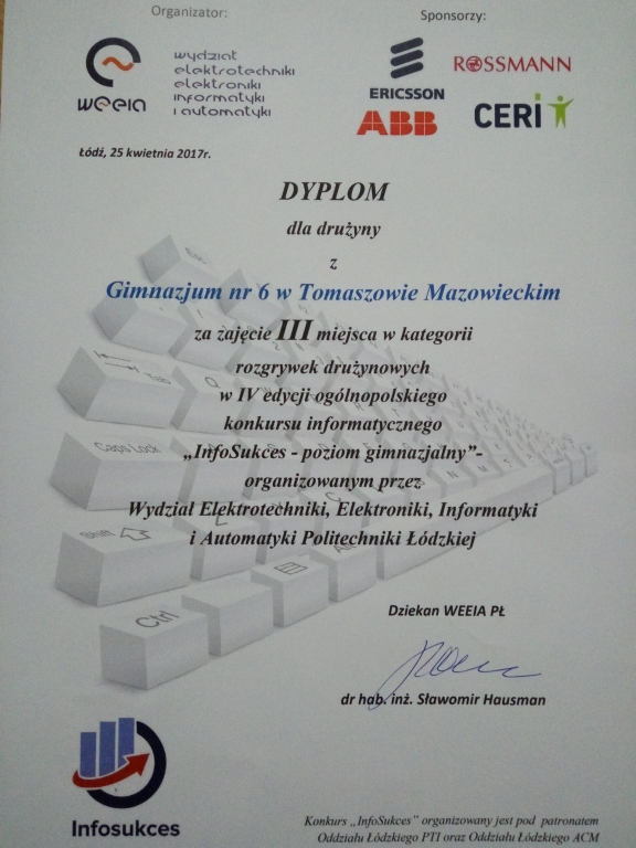 Uczniowie „szóstki” znaleźli się również w finale Ogólnopolskiego Konkursu Informatycznego InfoSukces, organizowanego przez Wydział Elektrotechniki, Elektroniki, Informatyki i Automatyki Politechniki Łódzkiej. Od tego roku konkurs na poziomie gimnazjalnym jest konkursem kuratoryjnym.
