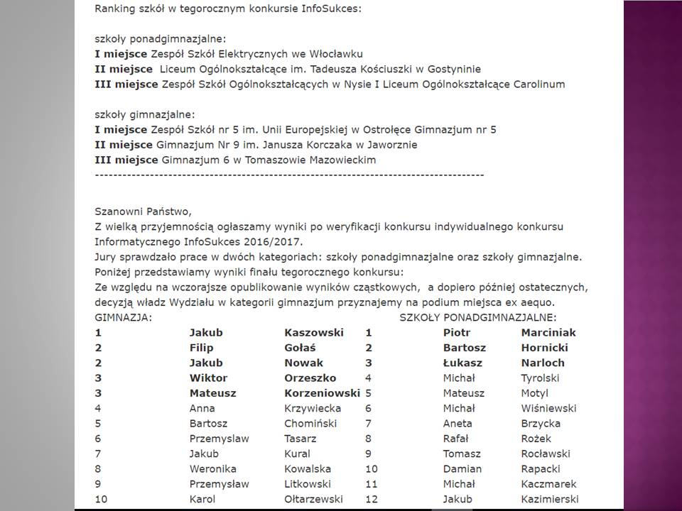 Wśród bardzo wielu prac z całej Polski, do kolejnego etapu zostało zakwalifikowanych 30 gimnazjalistów, a wśród nich troje z Gimnazjum nr 6 w Tomaszowie Mazowieckim:
