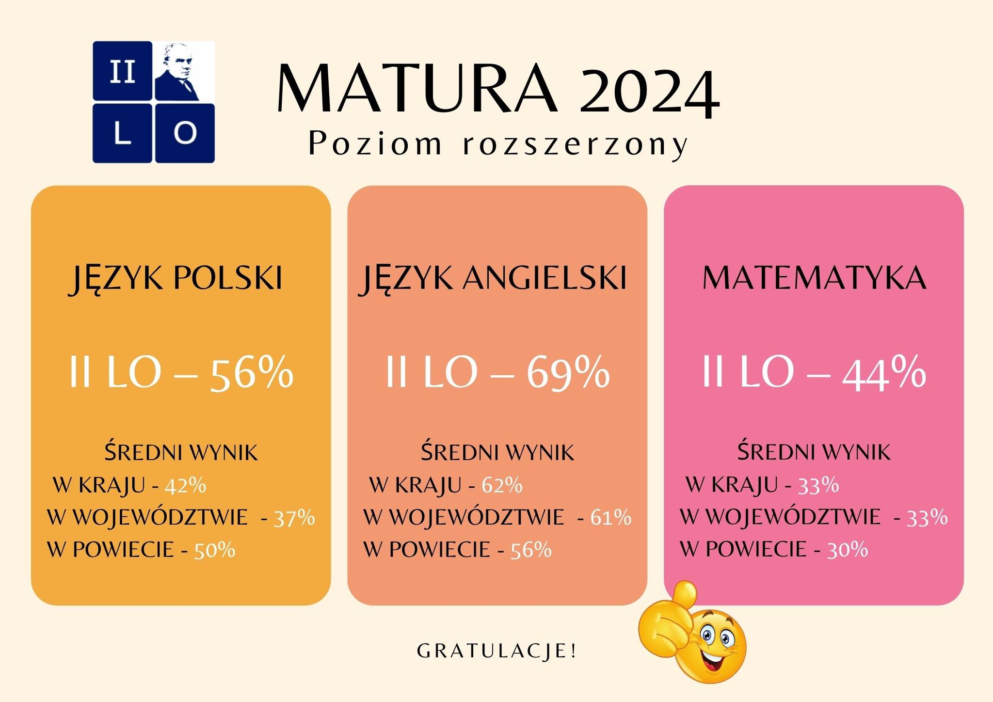 Średnie wyniki egzaminów z poszczególnych przedmiotów są wyższe niż średnie wyniki w powiecie, województwie i kraju. To jest bardzo ważny wskaźnik, ponieważ pokazuje, że uczniowie II LO są bardzo dobrze przygotowywani do egzaminów maturalnych. Szczegółowe informacje dotyczące wyników matur są dostępne na stronach szkoły.