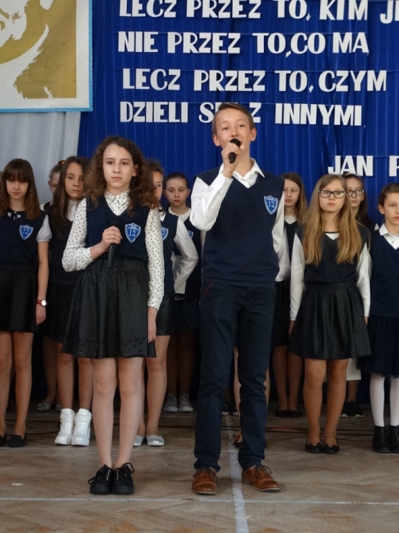 W ramach obchodów Dnia Patrona Szkoły odprawiona została Msza św. w kościele parafii Św. Antoniego oraz odbyła się uroczystość przy kamieniu pamiątkowym przed budynkiem szkolnym, gdzie złożono kwiaty i zapalono znicze. W murach szkoły wszyscy zaproszeni goście mieli możliwość obejrzenia programu artystycznego przygotowanego przez uczniów SP 12, którego mottem były słowa: „…by każdy był dobry jak chleb”. Młodzi artyści, wywołując wzruszenie na wielu twarzach, młodzi starali się zachęcić wszystkich do pójścia drogą miłosierdzia, tak jak to czynił ich Patron - Jan Paweł II.
