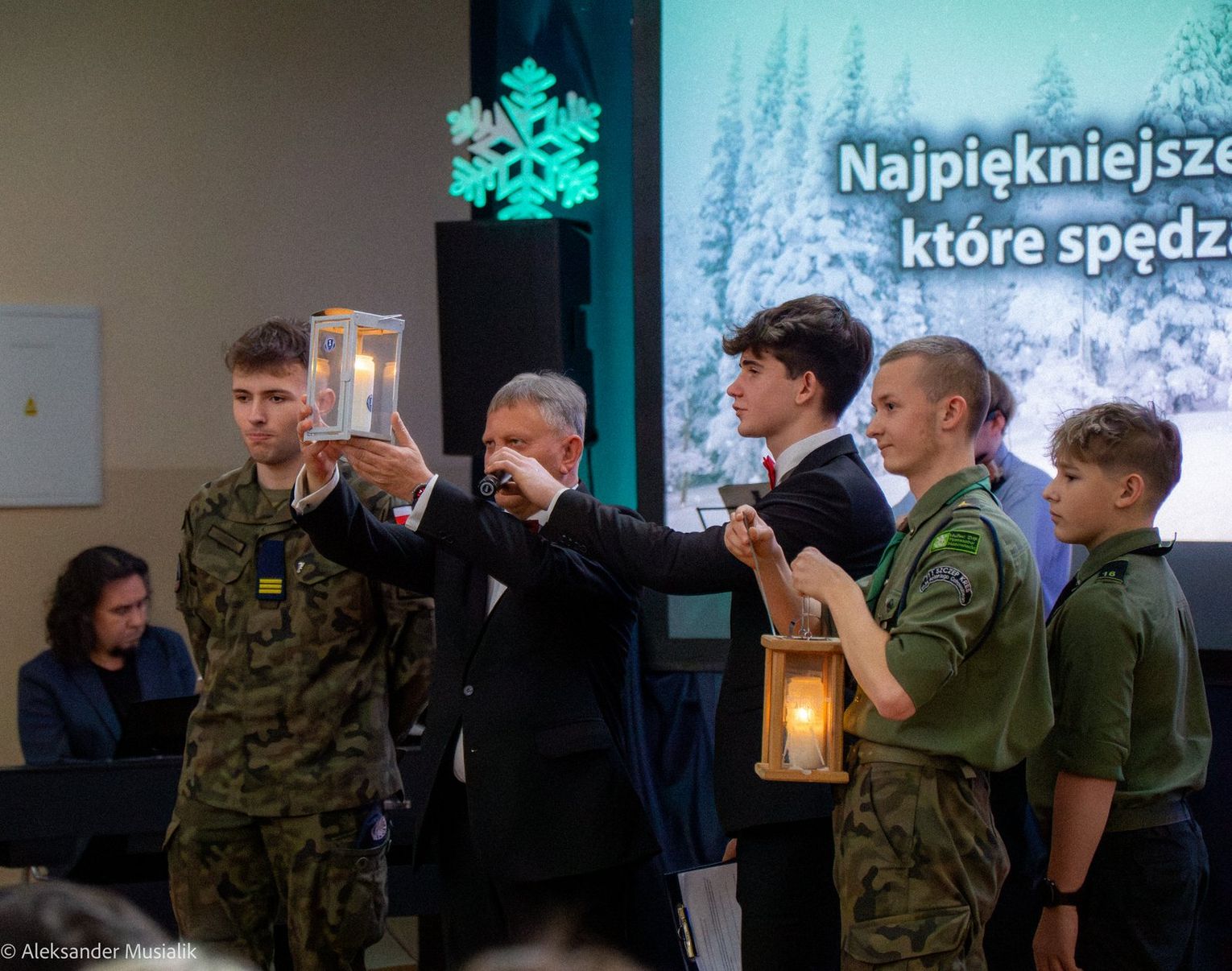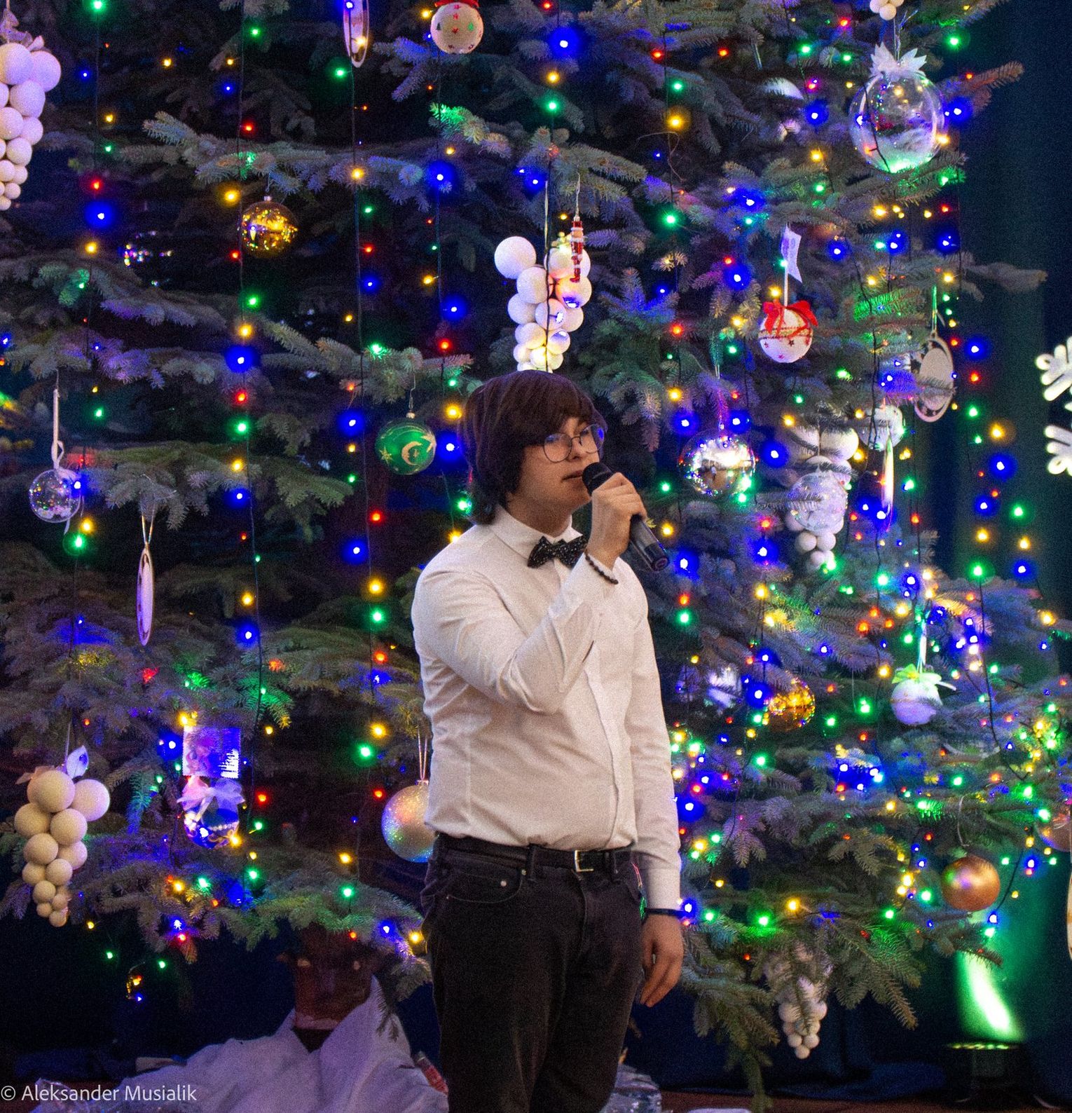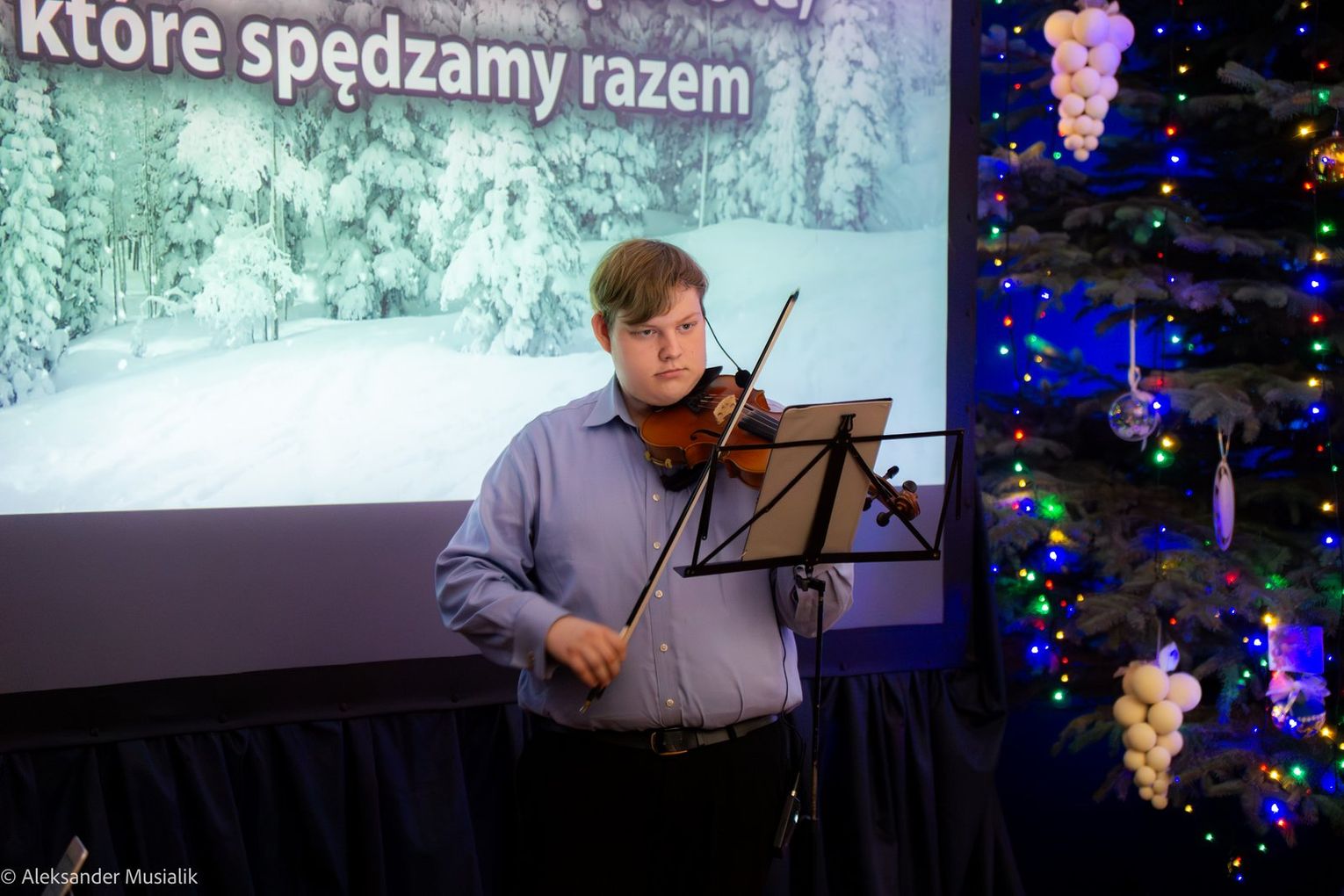 Nie zabrakło także występów muzycznych: Olek Kość i Oliwia Sobiesiak wprowadzili wszystkich w świąteczny nastrój wykonaniem pięknych kolęd i pastorałek. Podczas przedstawienia publiczność miała okazję wysłuchać również fantastycznego występu Sebastiana Badka, który zachwycił swoją grą na skrzypcach. Za oprawę muzyczną całego wydarzenia odpowiedzialny był p. Piotr Goljat, który nie tylko koordynował występy, ale także pięknie akompaniował na klawiszach, dodając wyjątkowego uroku każdej muzycznej interpretacji.