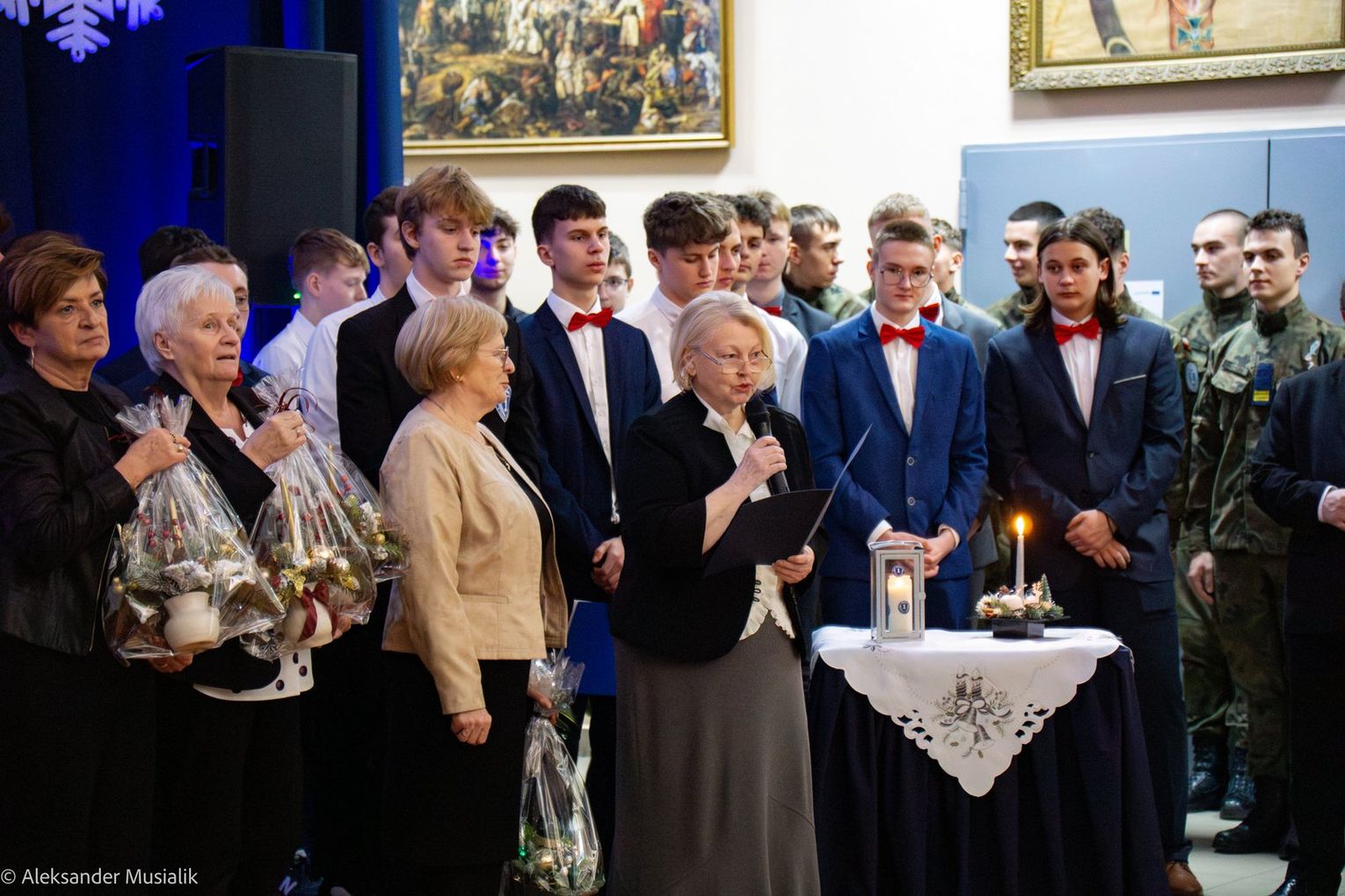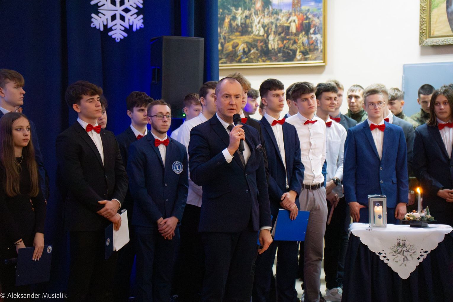 Spektakl rozpoczął się od krótkiego przemówienia dyrektora szkoły, Dariusza Kwiatkowskiego, który powitał zebranych gości. Uczniowie klas 1 Iw i 3Et zaprezentowali inscenizację opowiadającą o duchu Świąt – o miłości, życzliwości i rodzinnych wartościach.