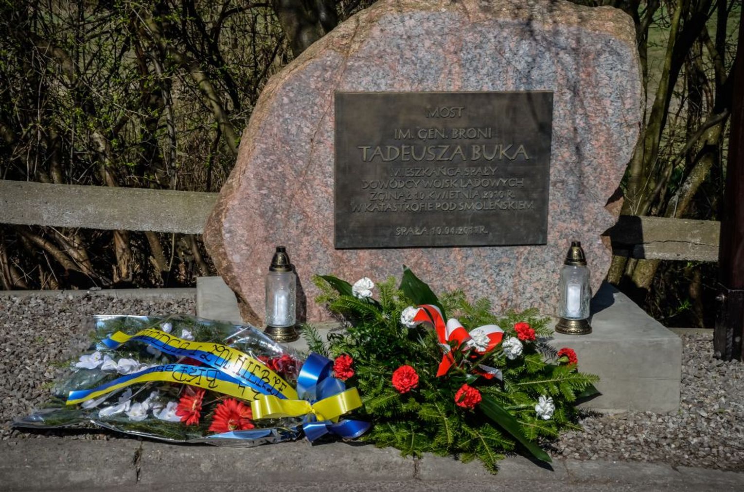 Ostatnim elementem uroczystości było złożenie kwiatów oraz zapalenie zniczy przed kamieniem z tablicą pamiątkową przy moście im. gen. broni Tadeusza Buka na rzece Pilicy w Spale.