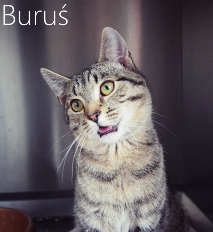 - jest młodziutkim, niespełna rocznym kocurkiem, który ma za sobą smutne wspomnienia. Jako dzieciak wpadł pod koła samochodu, trafił do nas z poturbowaną, przednią łapką. Kilka tygodni łapa była usztywniona w gipsie. Buruś dochodził do siebie i nabierał sił.Teraz gips został zdjęty, a jego łapka wraca do pełnej sprawności. Od samego początku jest bardzo pogodnym, radosnym kotem. Uwielbia kontakt z ludźmi i innymi kotami. Jest bardzo energiczny, chętny do zabawy. Pilnie szukamy dla niego domu niewychodzącego.