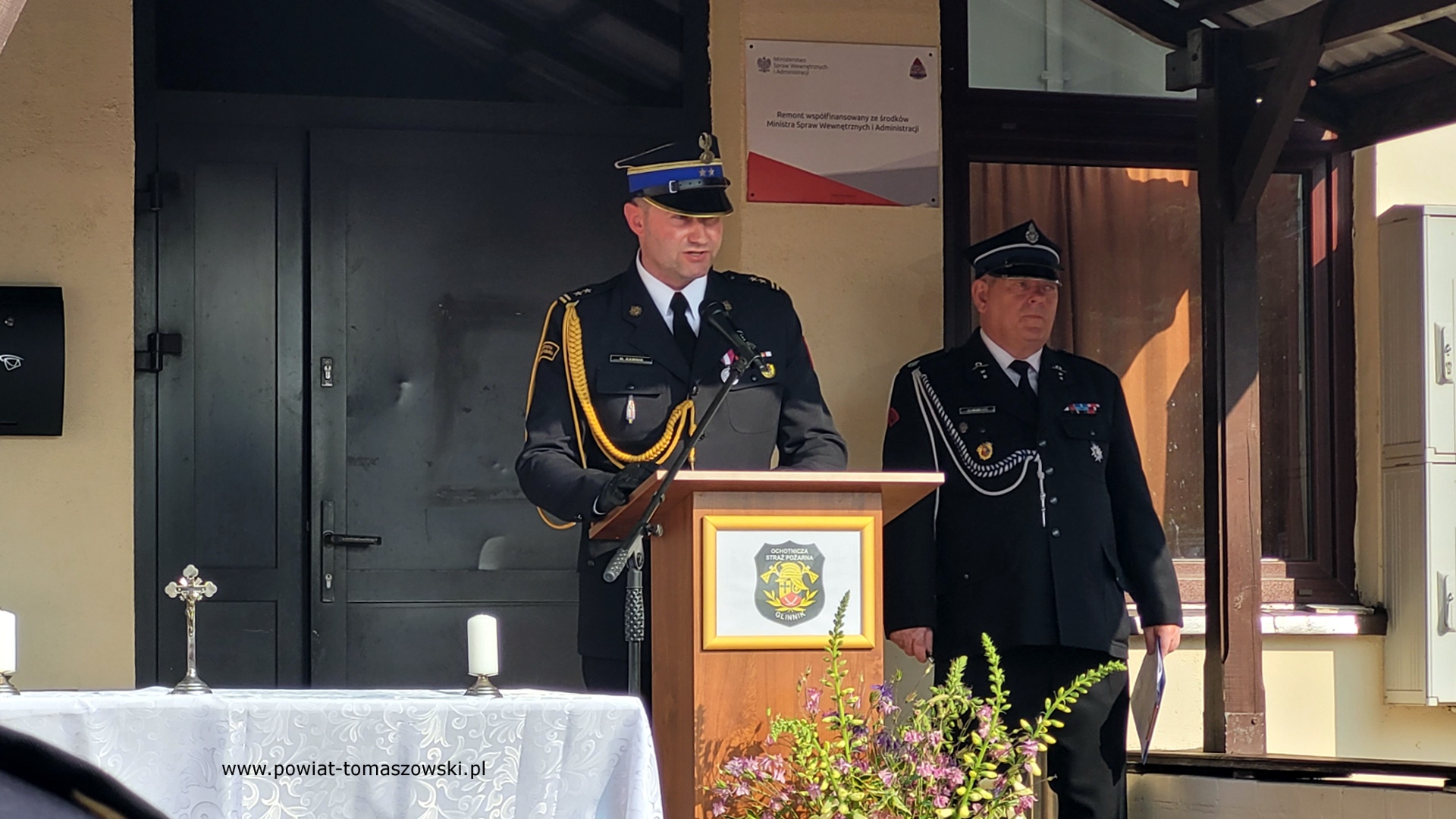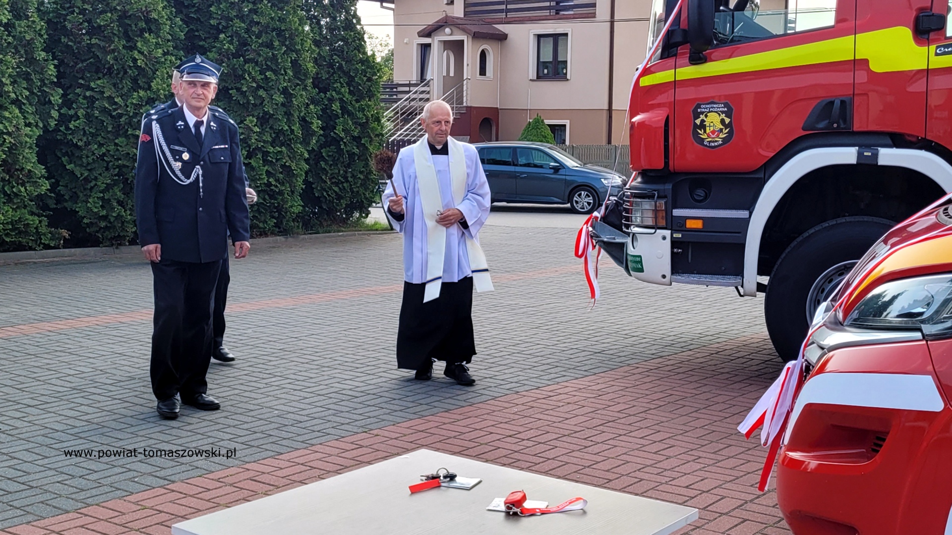 Uroczystości przekazania pojazdów rozpoczęło złożenie meldunku przez druha Grzegorza Karwasika, druhowi Tadeuszowi Cisowskiemu – Wiceprezesowi Zarządu Oddziału Wojewódzkiego Związku OSP RP w Łodzi. Następnie odprawiona została msza polowa, którą celebrował ks. Dariusz Łosiak – proboszcz parafii pw. Matki Bożej Królowej Korony Polskiej w Spale. Po nabożeństwie duchowny poświęcił oba samochody, które niebawem rozpoczną służbę w strukturach OSP Glinnik. Symboliczne przekazanie dokumentów i kluczyków do pojazdów nastąpiło tuż po poświęceniu. Otrzymali je kierowcy nowych aut – Dominik Mołojec i Jakub Mołojec.